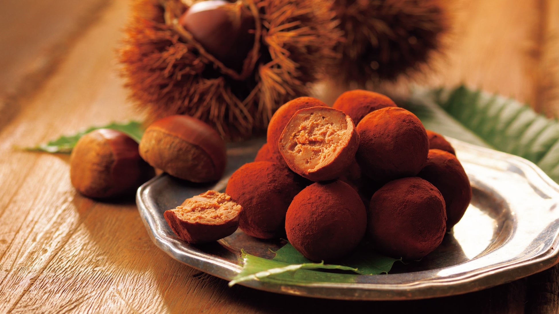栗風味のなめらかなミルクチョコレートガナッシュにイタリア産の栗を使ったマロングラッセの粒を混ぜ込んで、甘さ控えめのチョコレートで包みました。隠し味の栗のリキュールが風味をさらに引き立てます。
