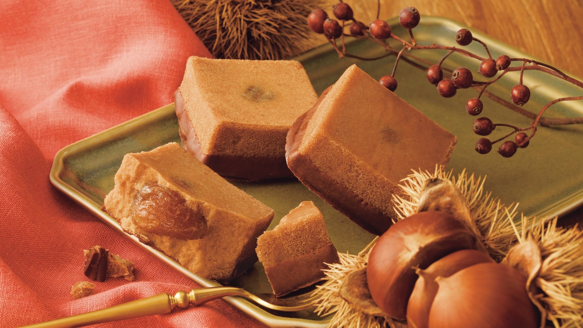 マロンクリームと焼き栗の香ばしさを生かしたペーストやマロンチョコレート、マロンリキュールを合わせた生地に、糖漬けしたイタリア産マロンを入れて蒸し焼きにしました。しっとりなめらかな口あたりとともに、栗の濃厚な味わいが広がります。