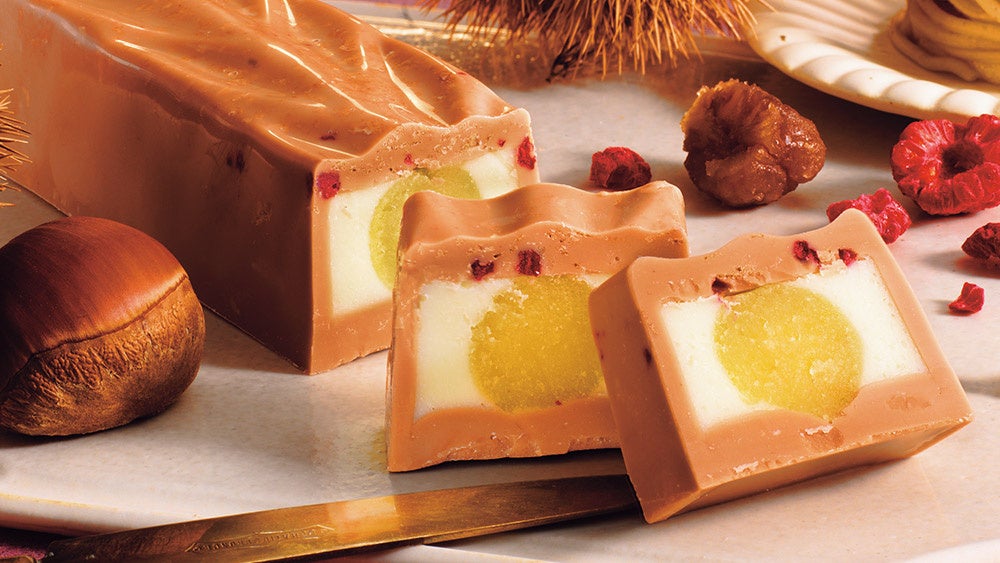 栗の甘露煮を使ったペーストとラム酒を効かせたホワイトチョコレートのガナッシュを、栗風味のチョコレートに閉じ込めました。外側のチョコレートに入れたフリーズドライのフランボワーズとフィアンティーヌが風味や食感にアクセントを加えています。