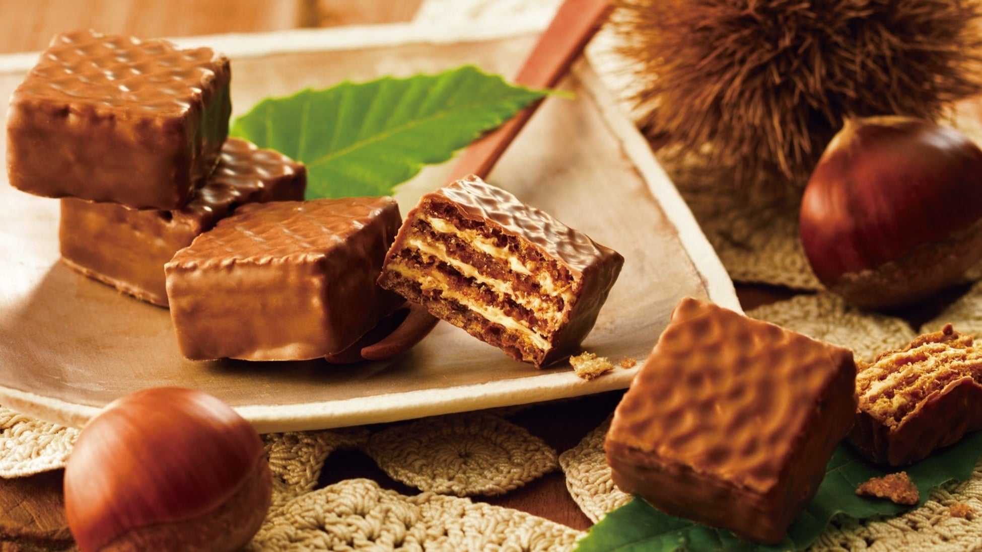 栗の風味が豊かに広がるリッチな味わいのモンブランクリームを、4層のウエハースでサンドし、やさしい甘さのチョコレートでコーティングしました。さくさくとした楽しい食感とまろやかな栗のおいしさが重なり合います。