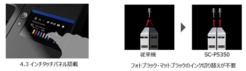 また、従来機(注1)では印刷する用紙を変更する場合に、用紙種類に応じて、フォトブラックとマットブラックの切り替えを行う必要がありました。『SC-P5350』では、フォトブラックとマットブラックのインクの経路を分割したことで、インクの切り替えが不要となり、タイムロスの無いスムーズなオペレーションが可能となっています。