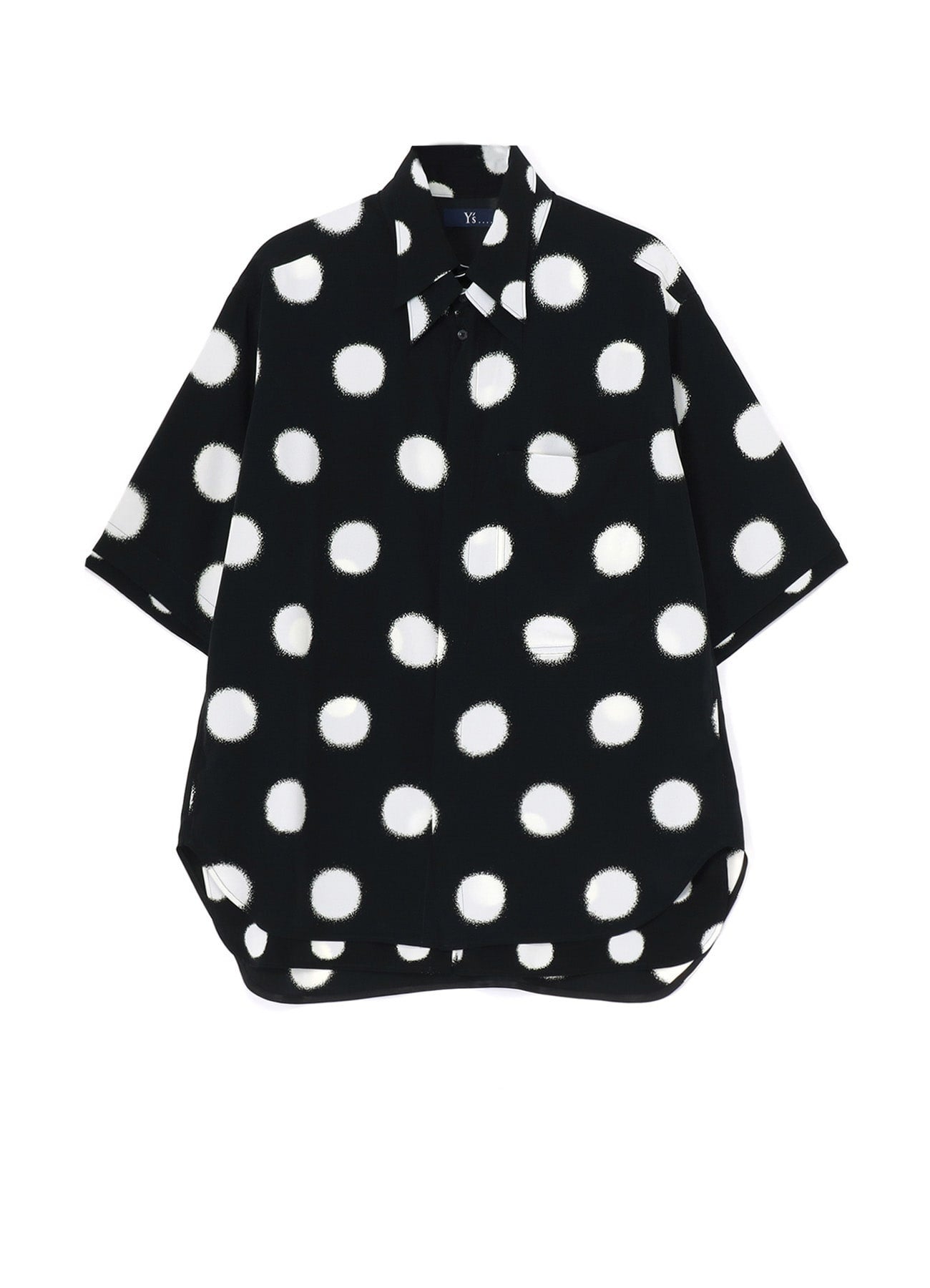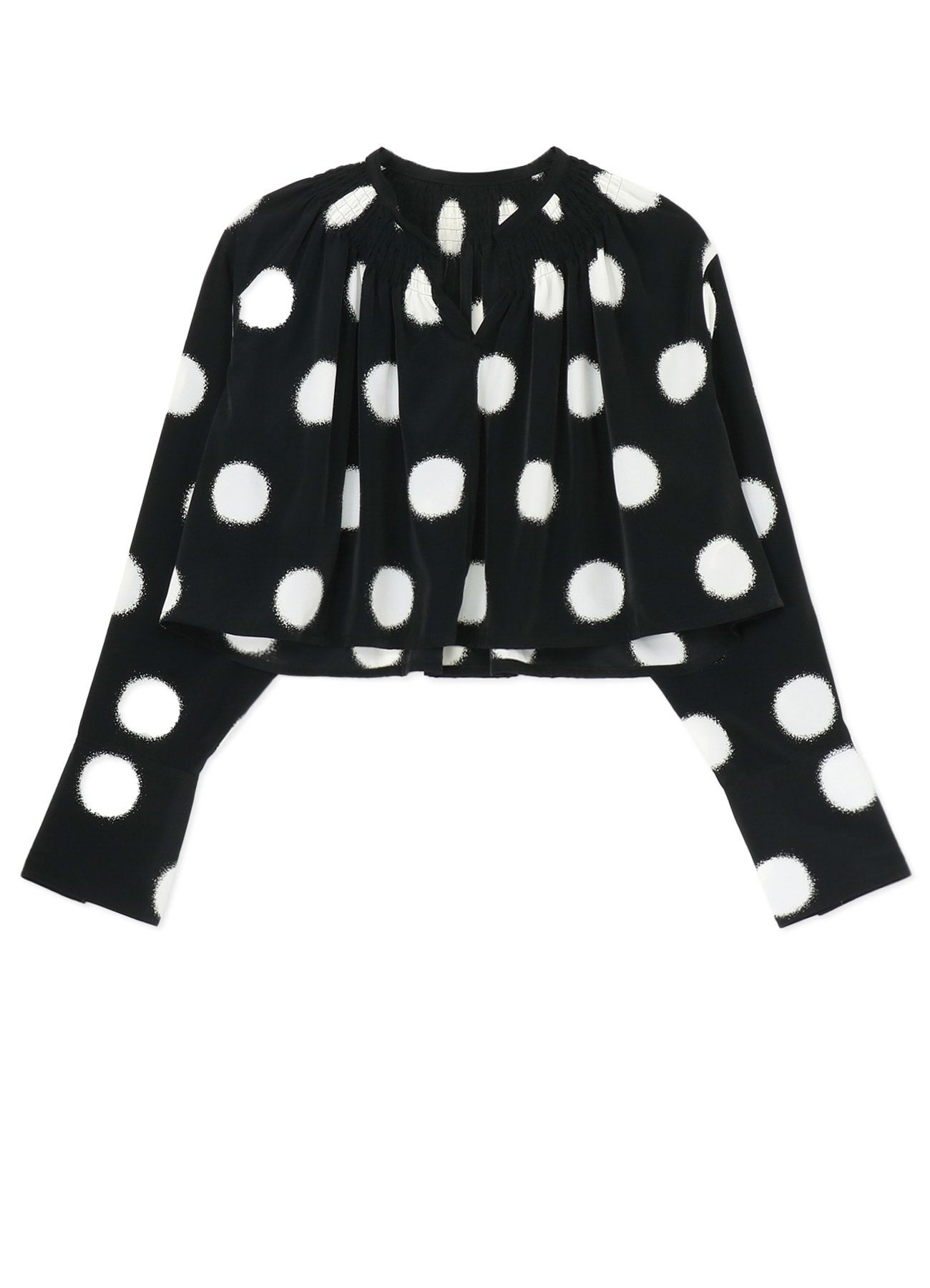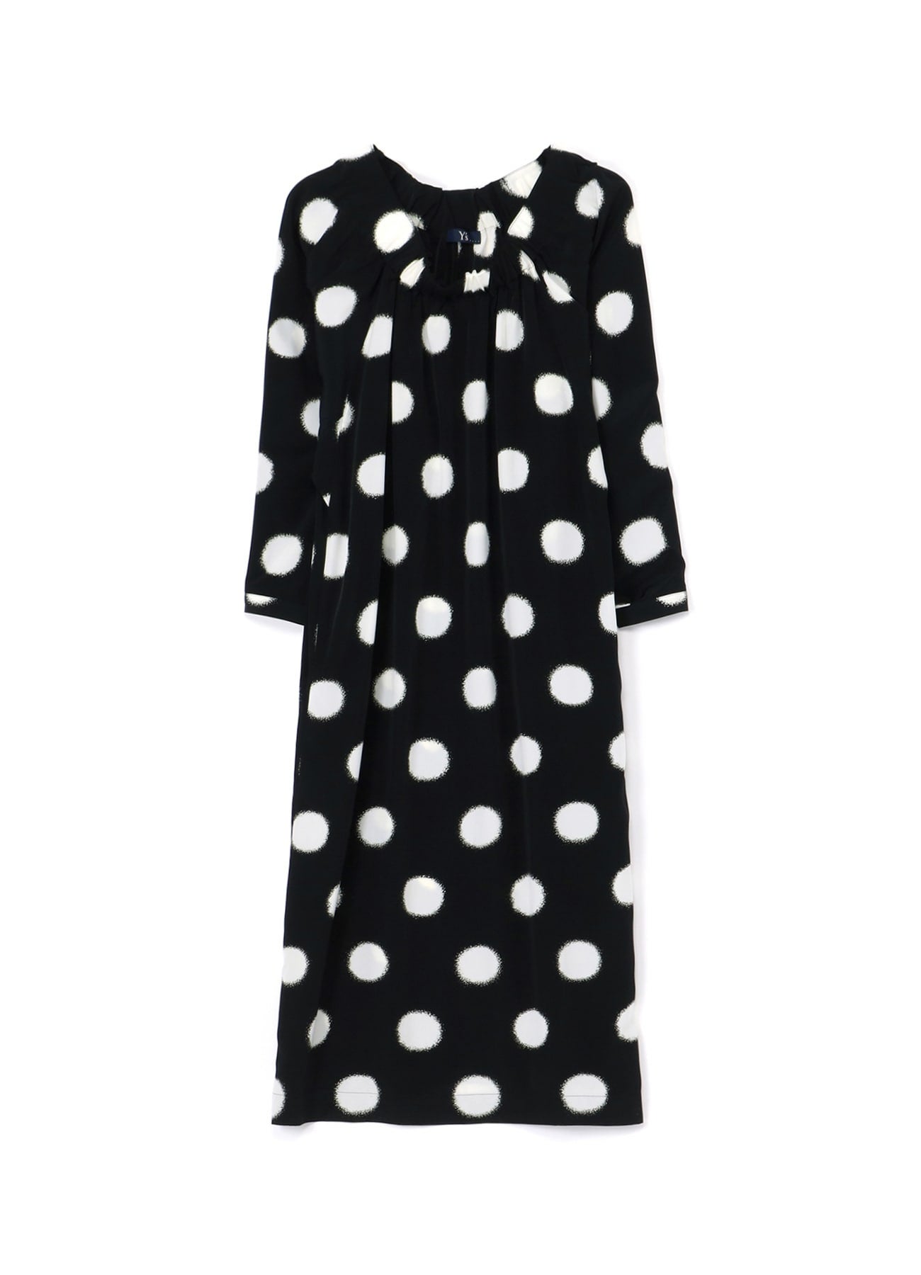 Y'sアーカイブの水玉柄を模し、水玉と黒の境目に崩しが加えられた印象的な模様。目を引く水玉柄の生地や、柔らかな黒の生地が今季を象徴する服の型に仕立てられ、ドレープが身体を包みます。