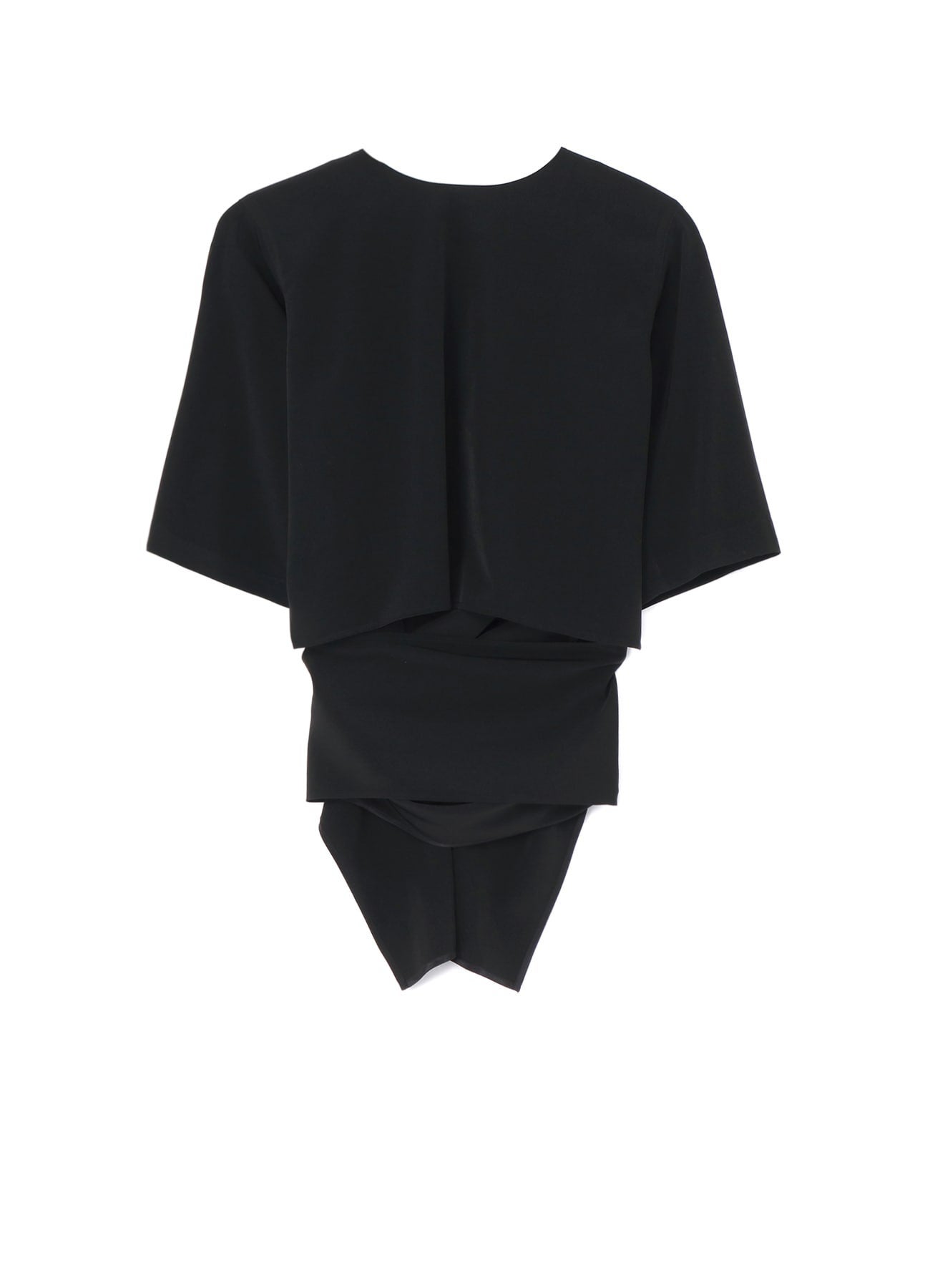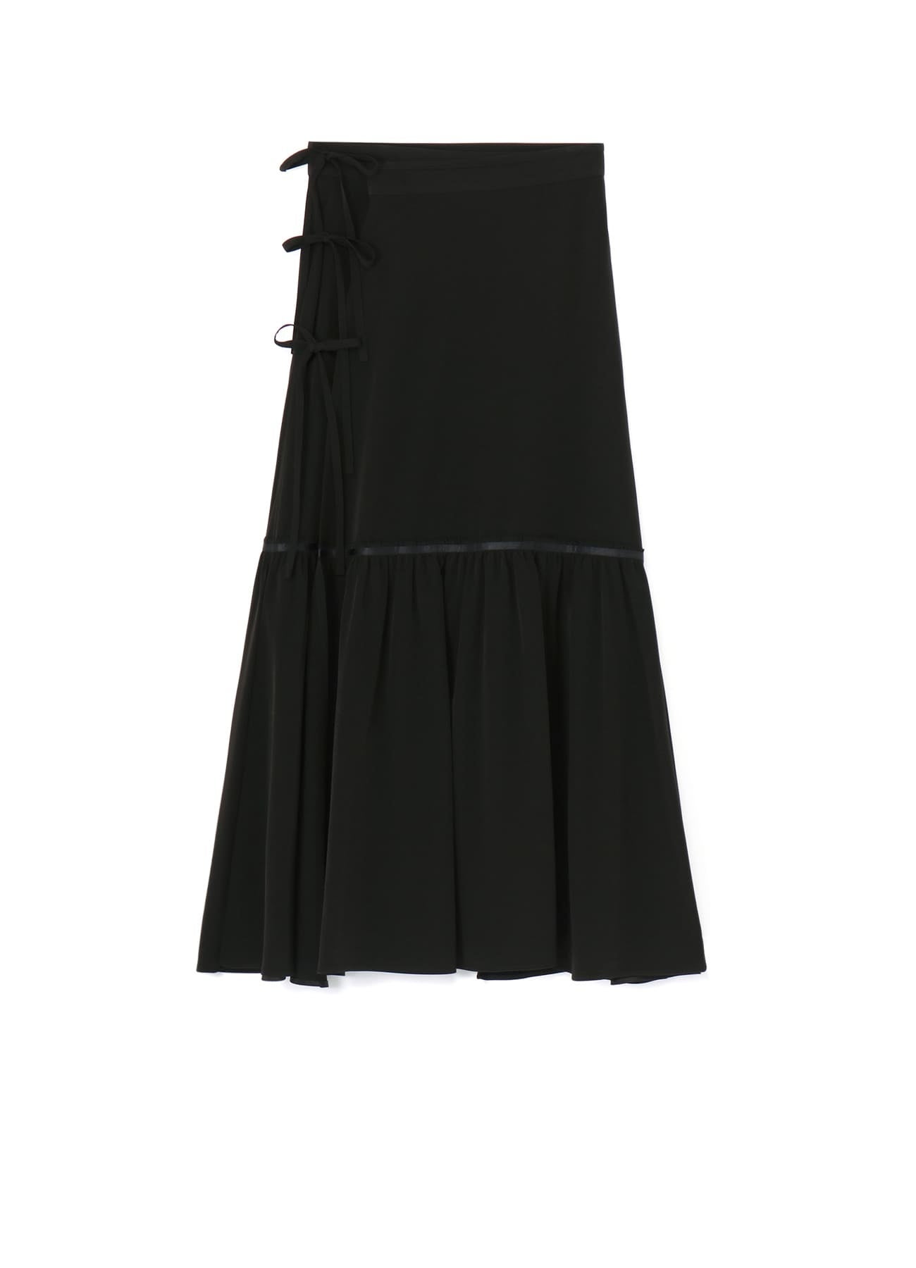 後ろに垂れた2つの尾のような部分をクロスして前に回し、再度後ろに回してボタンで留める仕様の腰巻きブラウス。複数のボタンで巻き加減の調整が可能。同素材のティアードスカートは重くなくたおやかでコンテンポラリーな印象をつくる。