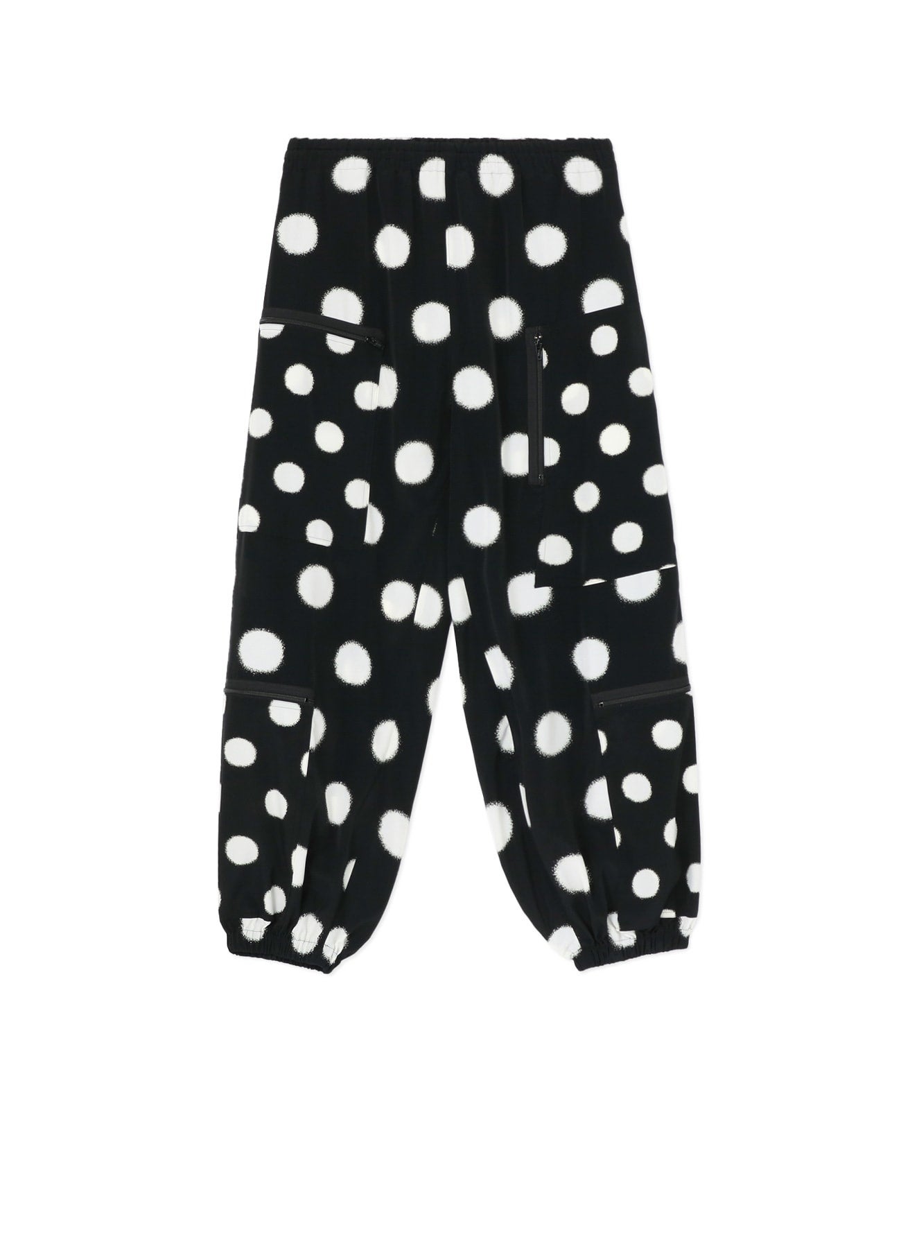 華やかな水玉柄のセットアップ。フロントが二重になり複雑に見える柄がスタイルに奥行きを生む。