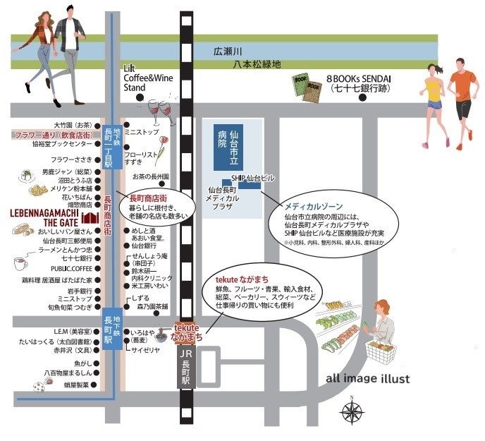 長町エリアは、駅を中心に「長町商店街(徒歩1分)」「tekuteながまち(徒歩7分)」が集積しているのをはじめ、飲食店、子育て施設、医療機関、自然の潤いなど、毎日の生活に必要な機能がコンパクトにそろう暮らしやすい街です。
