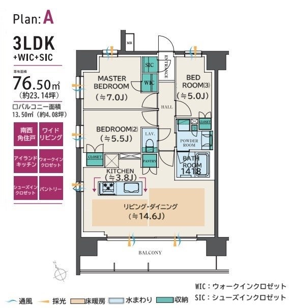 徒歩圏内の生活利便性に長ける本物件はタイムパフォーマンスに優れ、とくにファミリー世帯におすすめです。広めのリビング・ダイニングや収納スペースを確保することで、家族が多くても快適な暮らしを実現可能としています。例えば、Aタイプのプランではアイランドキッチンで通り抜けできるようにすることで、家事シェアで気になる混雑や無駄な回り込みの動線をカットし、ストレスフリーなレイアウトにしています。備え付けのパントリー、リネン庫、吊戸棚などで収納に困らない工夫も。シューズインクロゼットにはコンセントも付いています。南西向きの角住戸で通りから離れているので、騒音や人目を気にせずにプライベートな空間を確保しやすく、陽当たりや開放感を得られるところもポイントです。