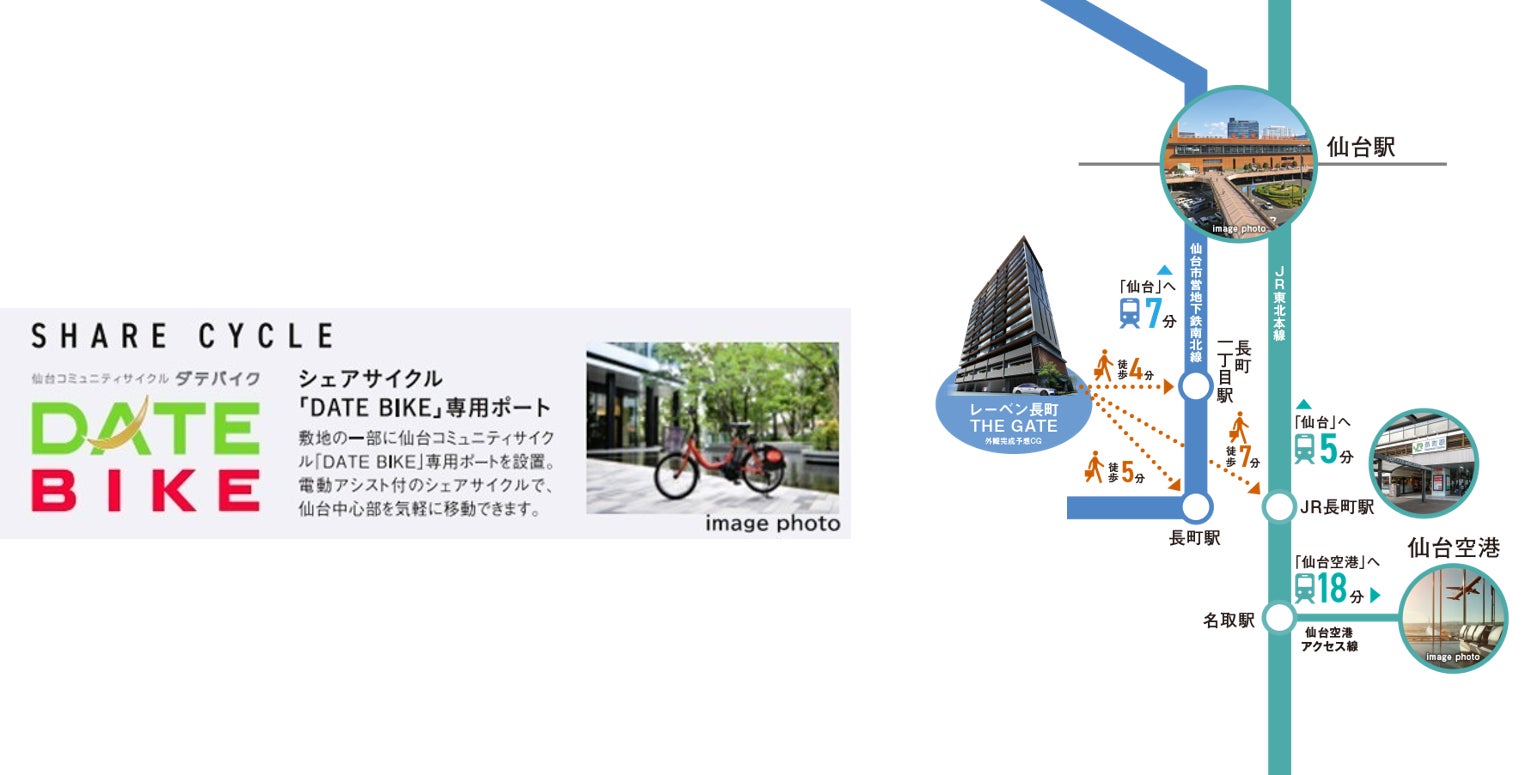 最寄り3駅までの道のりはすべてフラットアプローチであり、駅付近には「DATE BIKE」のサイクルポート(駐輪場)があるので、敷地内から自転車をレンタルして駅まで移動することもできます。