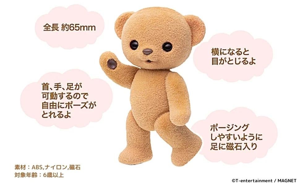 全身は見た目に柔らかさを感じる「フロッキー加工」を施し、さらに頭、手、足の関節が自由に動くので思い通りのポーズをとることができます。