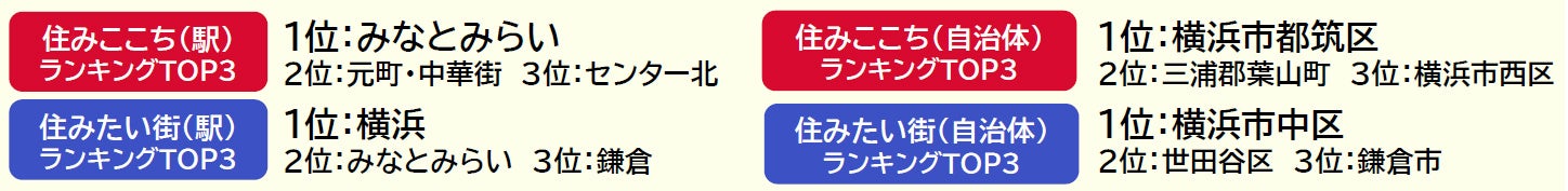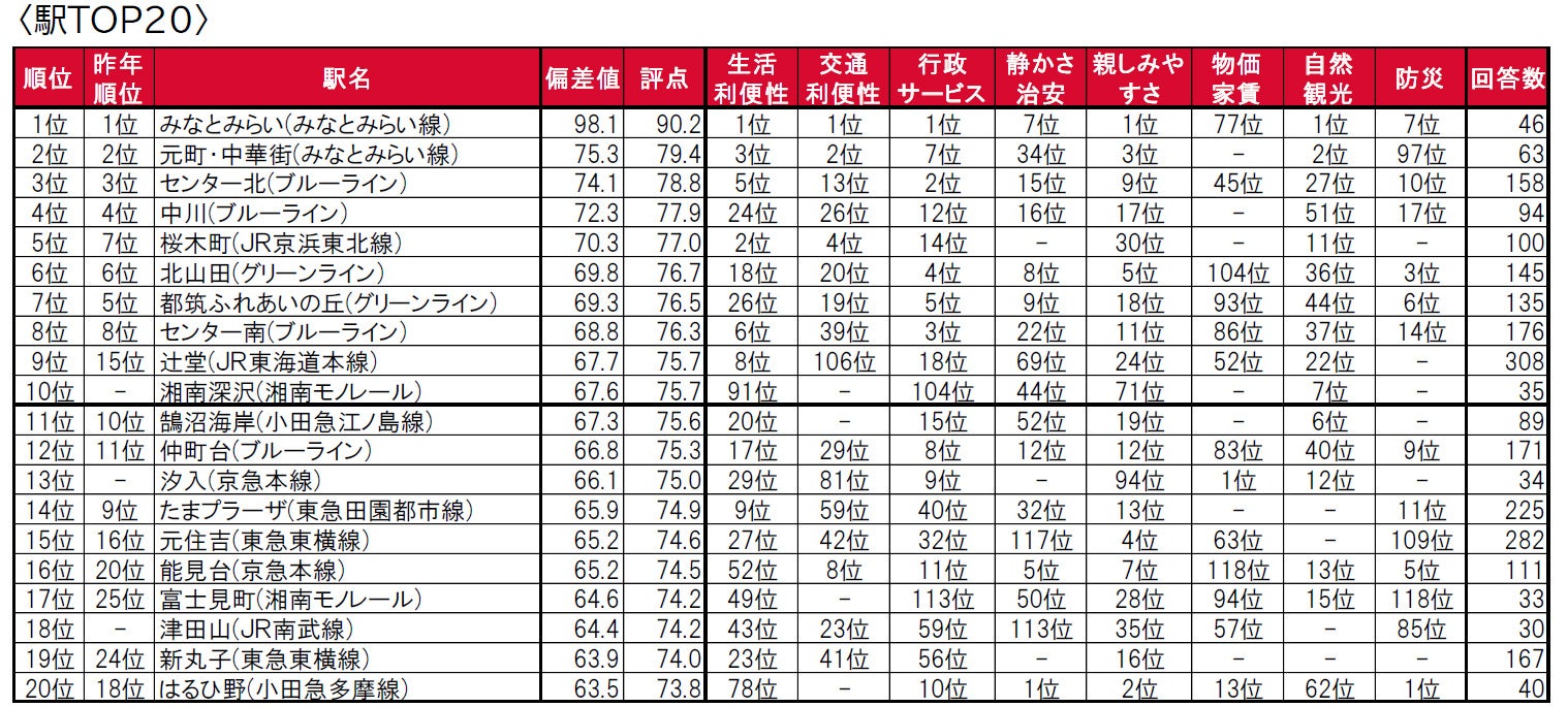 1位は、2年連続でみなとみらいです。また、2位と3位も2年連続で元町・中華街とセンター北となっており、昨年と同じ順位です。9位は辻堂で、昨年15位から順位を上げているほか、10位には、昨年は回答者数が30名に満たなかったため集計対象外だった湘南深沢が新たにランクインする結果となっています。