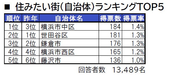 1位は、「住みここち(駅)ランキング」で2位の元町・中華街がある横浜市中区です。2位は、昨年1位の世田谷区、3位は、昨年2位の鎌倉市です。5位には、昨年から順位を上げて藤沢市がトップ5入りしています。