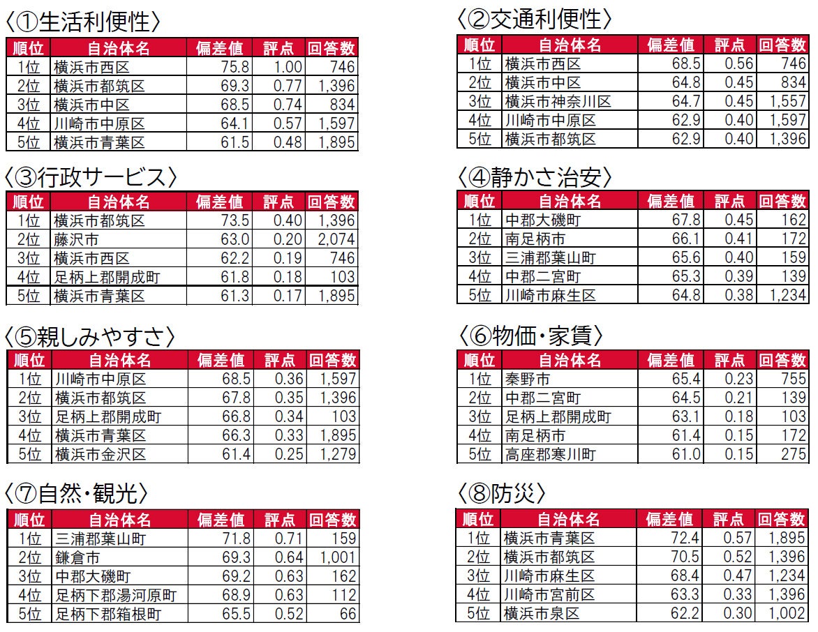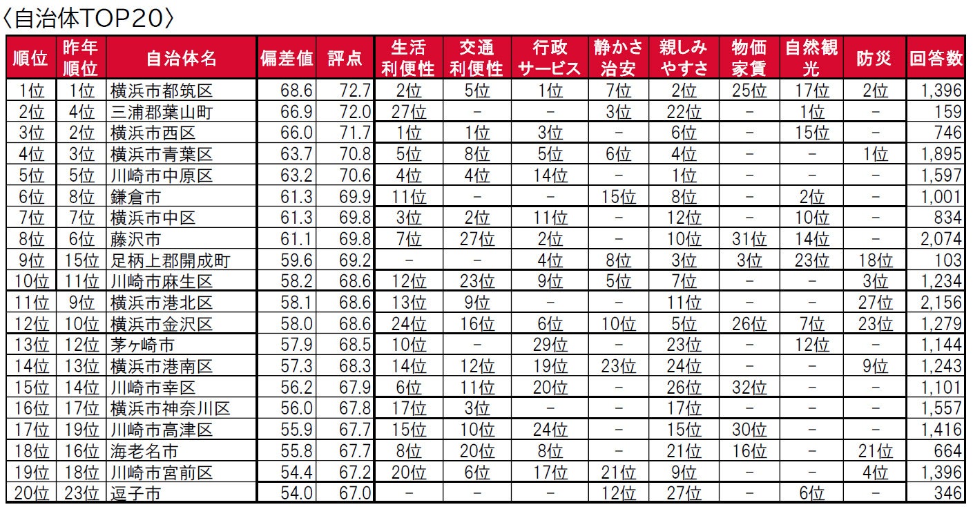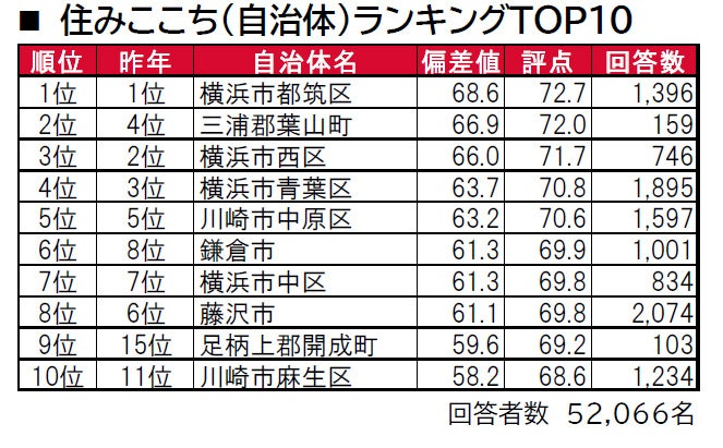 1位は、4年連続で横浜市都筑区、2位は、昨年は4位の三浦郡葉山町、3位は、昨年2位の横浜市西区です。9位には、昨年15位の足柄上郡開成町、10位には昨年11位の川崎市麻生区がそれぞれ順位を上げてトップ10入りしています。