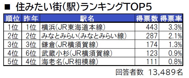 1位~3位は3年連続で変わらず、1位は横浜、2位はみなとみらい、3位は鎌倉です。駅周辺の再開発が進み、JRや東急線など鉄道が6路線利用できる武蔵小杉が、昨年から順位を上げて4位となっています。