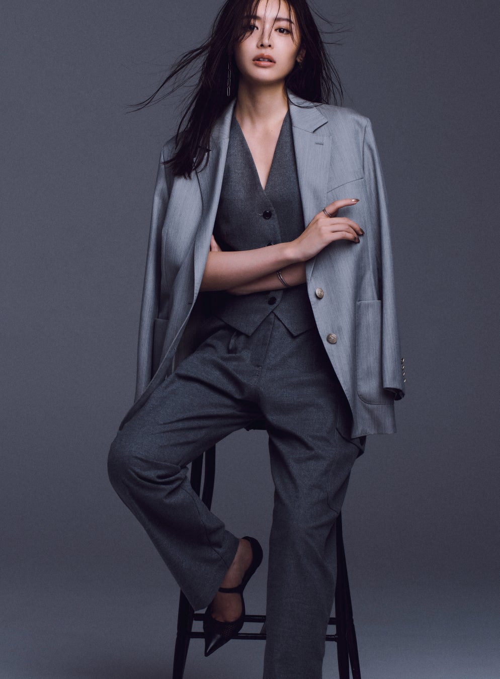 新たなステージとなるのは、30 代の働く女性のファッション誌。デビュー号となる 11 月号では、モノトーンのジャケットスタイルなど、大人のファシ ョンをかっこよく着こなしています。