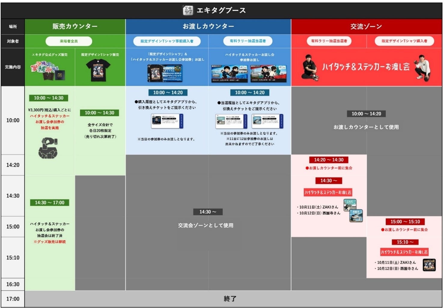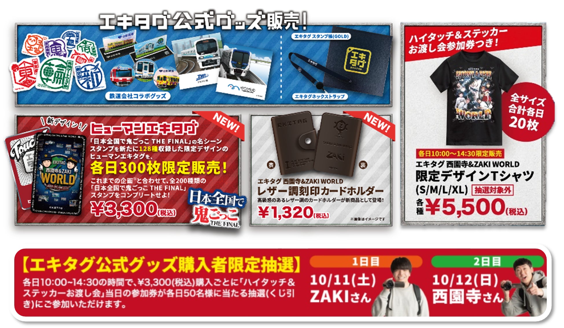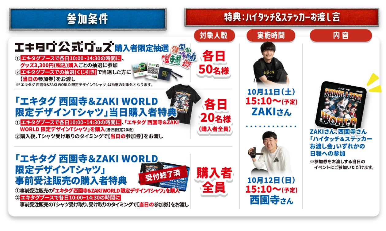 ●さらに、【各日10:00~14:30限定】で、「ハイタッチ&ステッカーお渡し会」参加券付き、「エキタグ 西園寺&ZAKI WORLD限定デザインTシャツ」(以下「限定デザインTシャツ」という)を、全サイズ合計で各日20枚販売いたします。