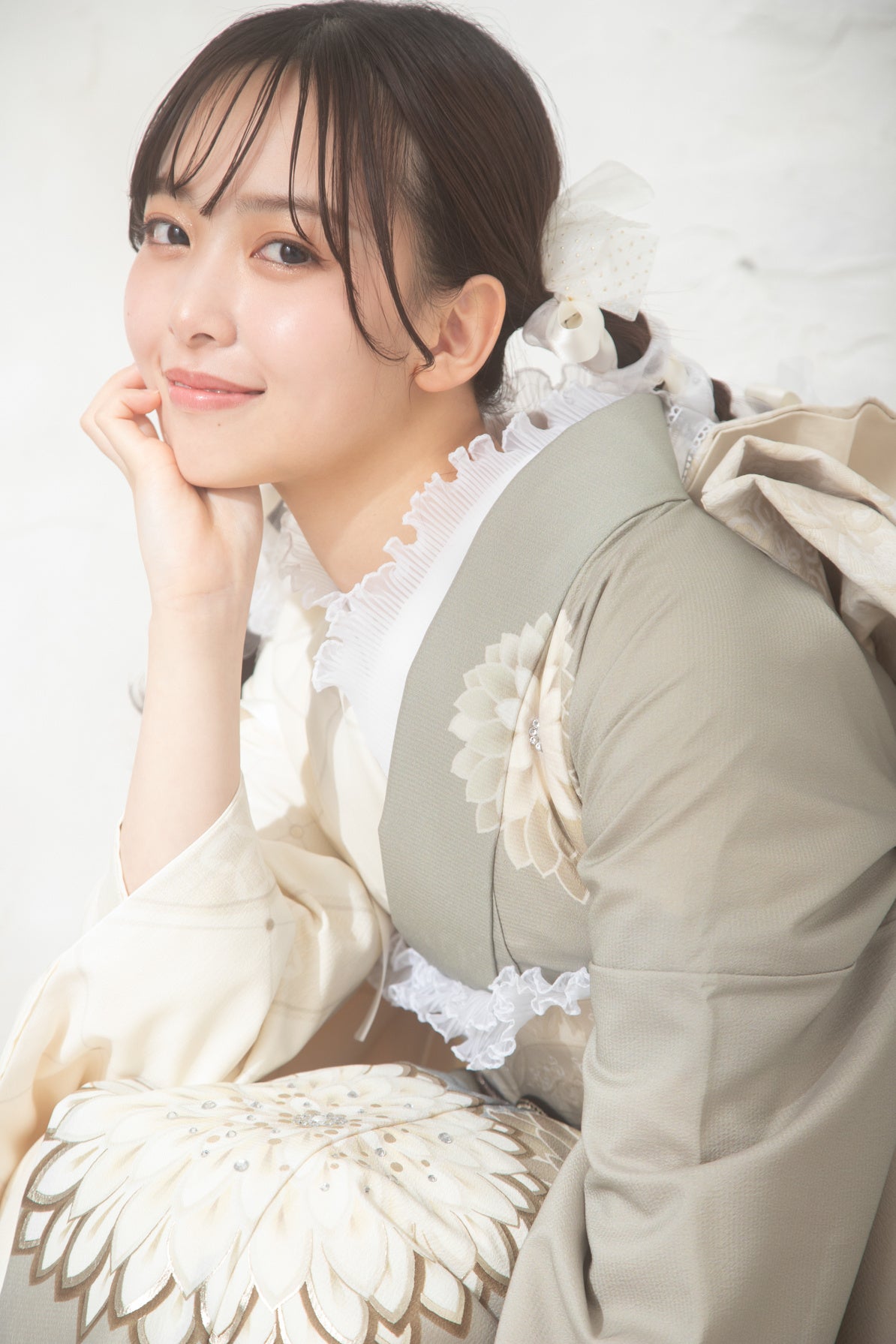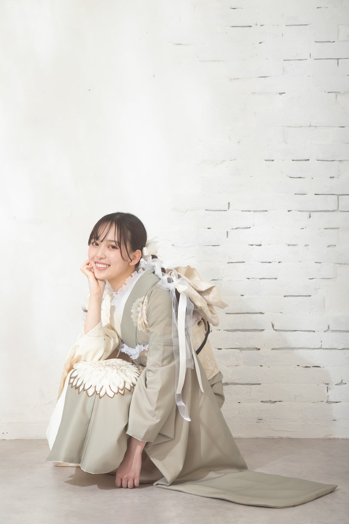 フリルの襟を合わせた振袖は、グレージュとオフホワイトのアシンメトリーデザインの新作振袖です。