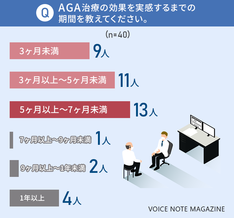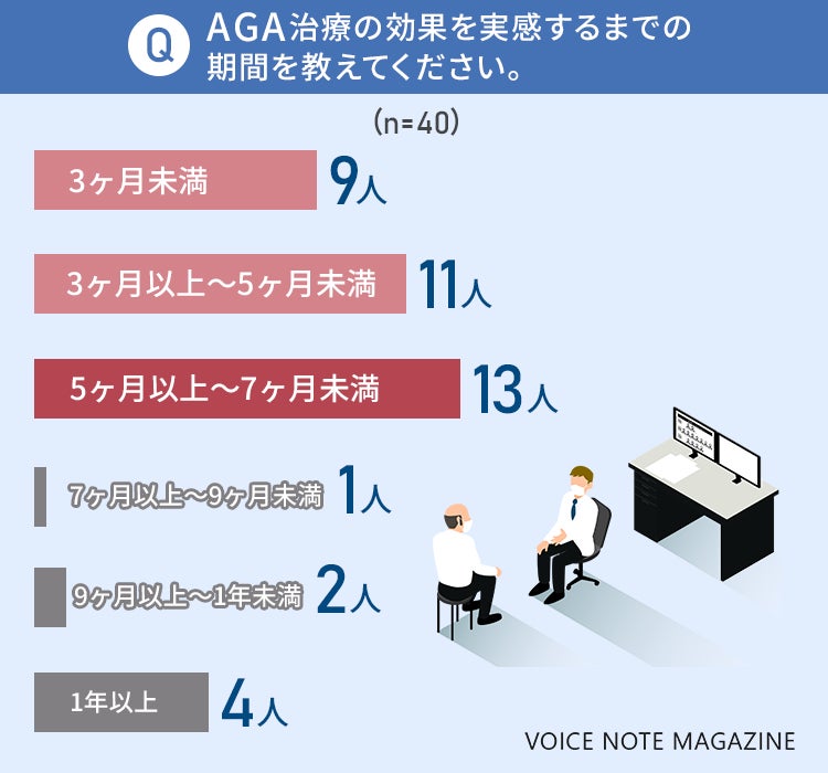 AGA治療の効果を実感するまでの期間として最も多かったのが、40人中13人(32.5%)が答えた「5ヶ月以上~7ヶ月未満」でした!