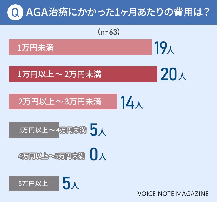 1ヶ月のAGA治療にかかった費用として最も多かったのが、63人中20人(31.7%)が答えた「1万円以上~2万円未満」でした!