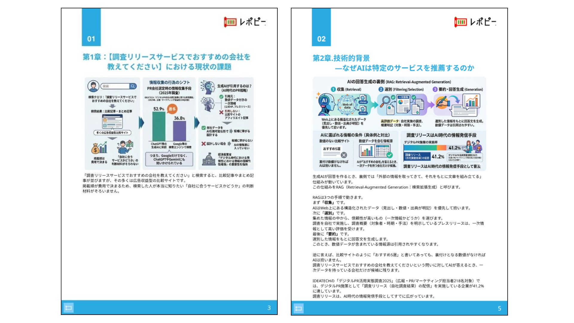 A.生成AIが回答を生成する際、RAG(検索拡張生成)という仕組みで一次情報を優先して引用します。調査概要(対象者・時期・手法)が明示されたプレスリリースは一次情報として高い評価を受けます。IDEATECHの「デジタルPR活用実態調査2025」(218名対象)では、デジタルPR施策として調査リリースを実施している企業が41.2%に達しており、AI時代の情報発信手段として普及しています。