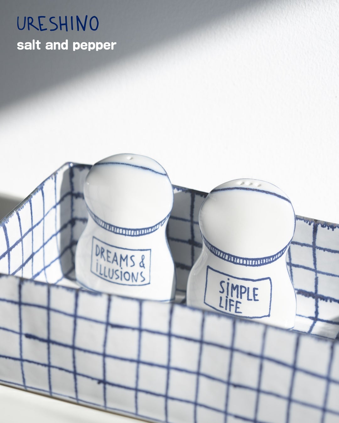 マリアンヌのジャパンシリーズより、嬉野肥前吉田焼の窯元で制作されたソルト&ペッパー。一つ穴の塩入れには「DREAMS & iLLUSiONS」、三つ穴の胡椒入れには「SiMPLE LiFE」。それぞれに、マリアンヌの言葉が刻まれています。底の栓を外して、塩や胡椒を補充することができます。