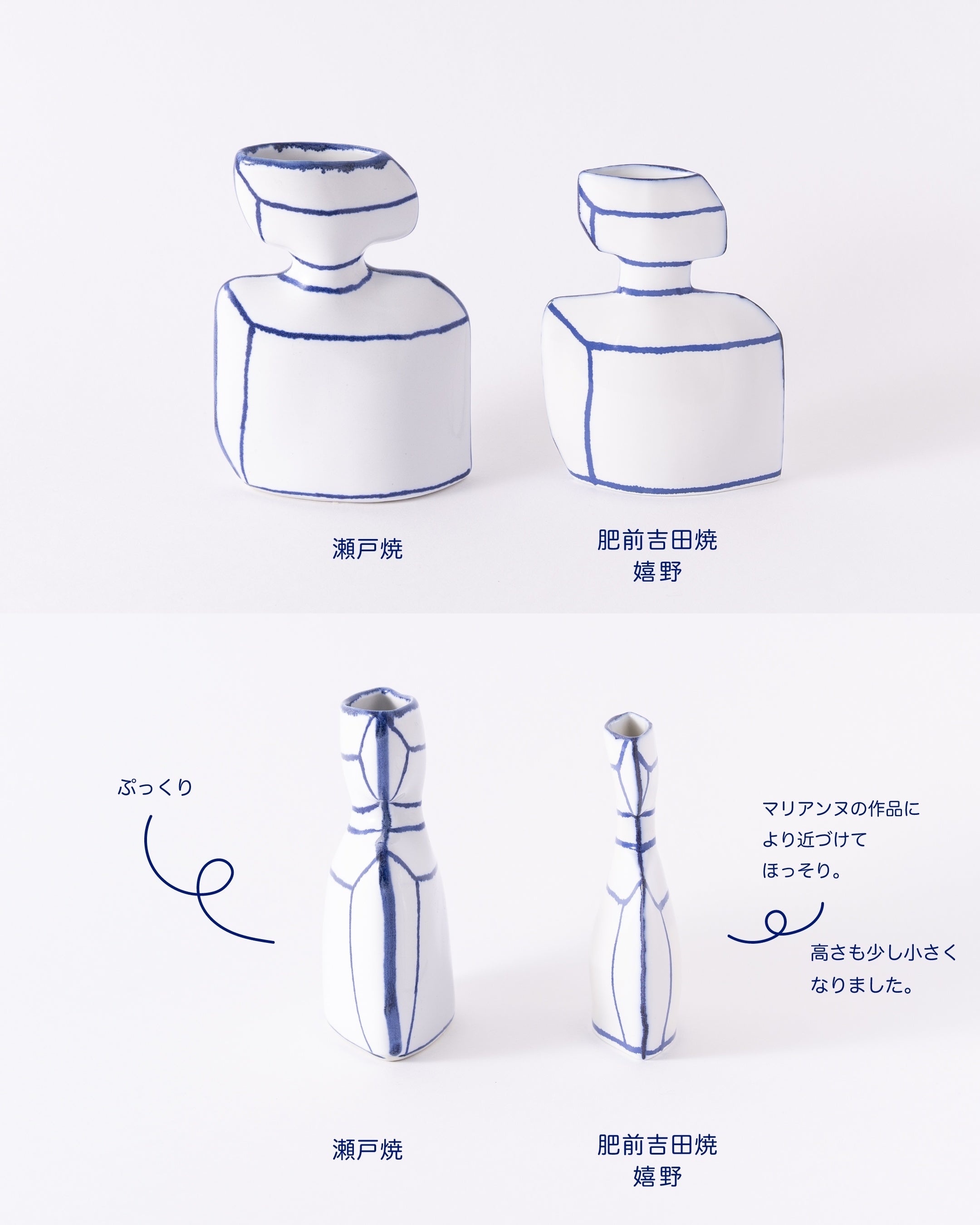 マリアンヌ・ハルバーグの作品の中でも不動の人気を誇る「香水瓶のかびん」が、嬉野肥前吉田焼でリニューアルしました。瀬戸焼の窯元でも生産していましたが、今回はマリアンヌのオリジナル作品をベースに、素材に合わせて細部を再構築。これまでのものより重さは軽く(150g→90g)、サイズも一回り(約1cmずつ)小さく、よりマリアンヌのオリジナル作品に近い、繊細な佇まいへと進化しました。