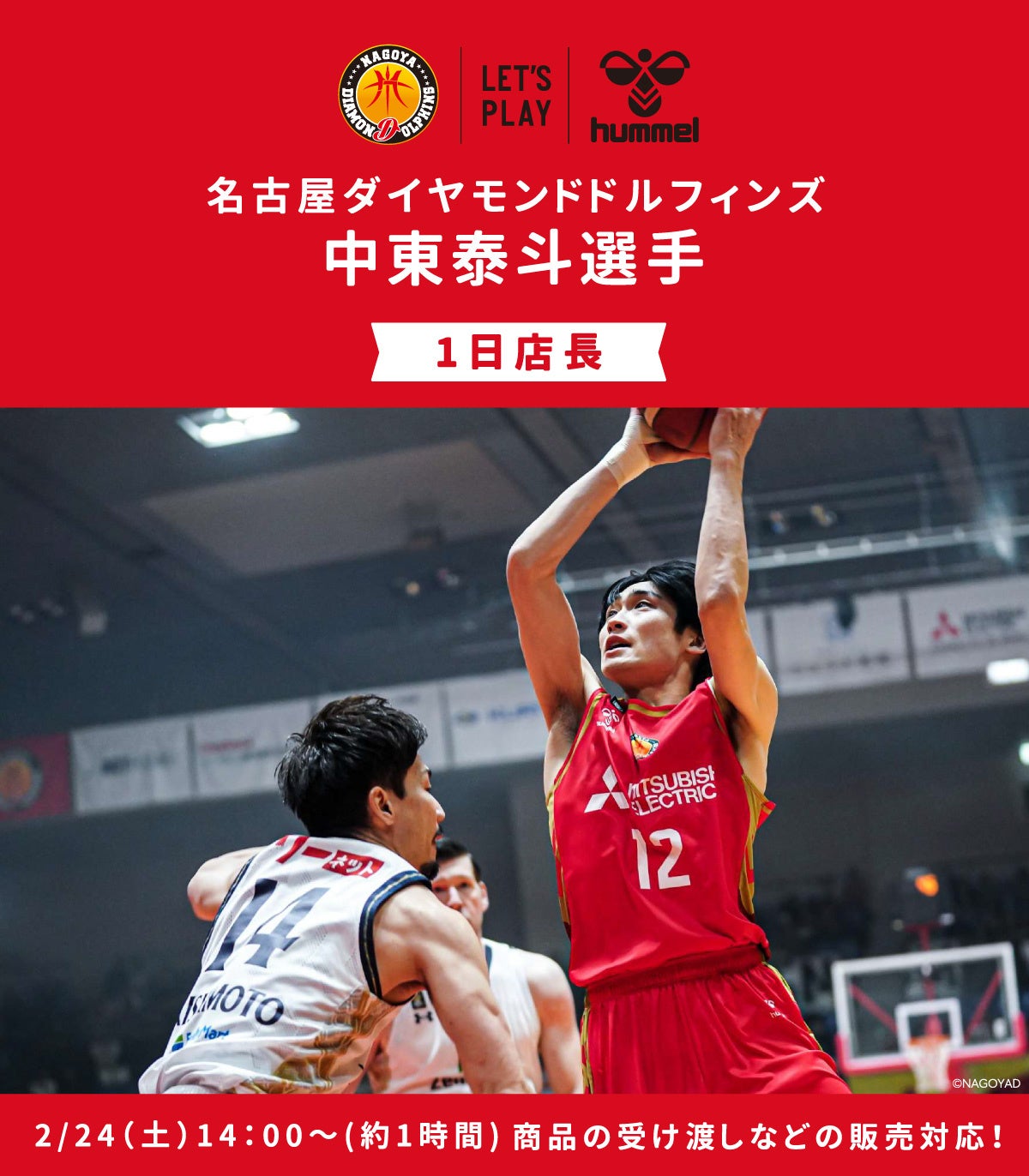 今回、東海地方で初となるヒュンメルショップオープンを祝し、ヒュンメルのサポートチームである名古屋ダイヤモンドドルフィンズから、中東泰斗選手の来店が決定!2月24日(土)14時から、サインイベントを実施し、オープニングを盛り上げてくれます。