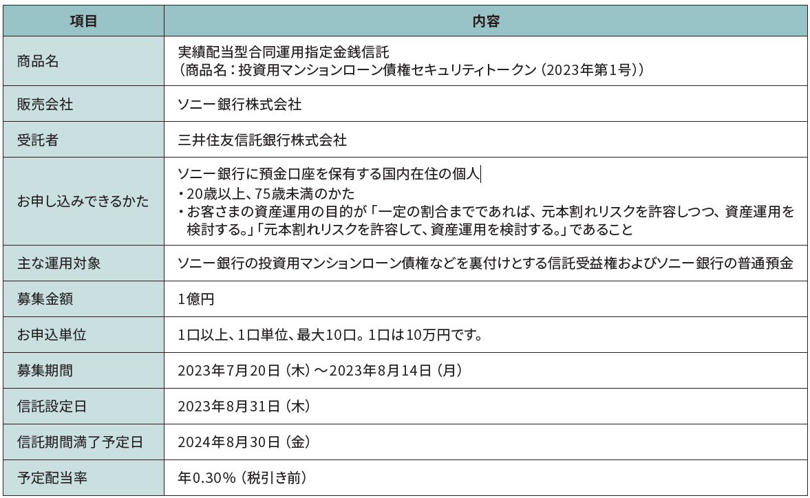 本商品はお客さまの信託金を、ソニー銀行の投資用マンションローン債権を裏付けとする信託受益権などで運用する、実績配当型合同運用指定金銭信託受益権で、ソニー銀行のデジタル証券の第一弾商品です。
