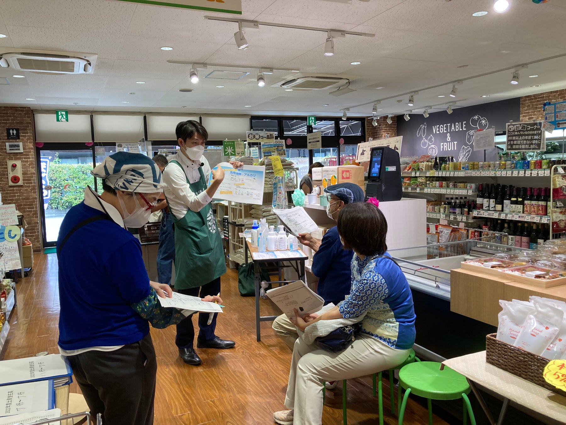 量り売りの利用方法は、持参した容器に液体を詰め、計量器で測って精算というシンプルな方法で、プラスチックを減らし、価格も容器分お得になる、環境にも家計にもやさしい暮らしのための取組みです。 7月8日(土)には、せっけんの生産者・ヱスケー石鹸が店内でミニ学習会を開催し、せっけん量り売りへの理解を深めました。