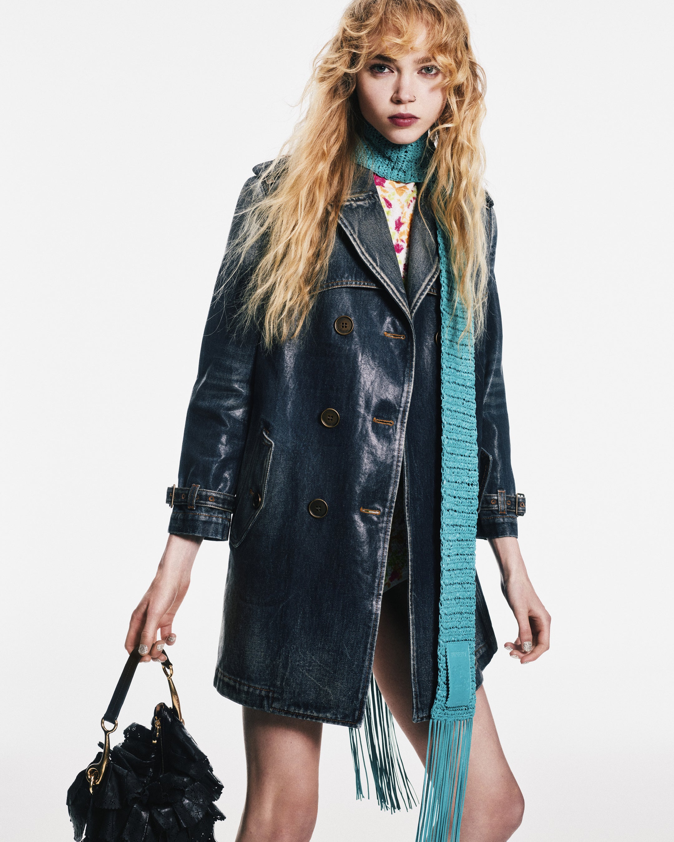 アウターウェアには、英国の夏に降る雨がきらめくような空気感を表現した新素材を採用。プリントトレンチコート、シルクのボンバージャケット、ワックスドコットンのオーバーサイズドパーカがラインナップします。ウォッシュドおよびローデニムにはフォイルコーティングを施し、濡れたような質感のレインコートにはコットンやラフィア調素材が使用され、鮮やかなチェックを織り込んで仕立てられています。