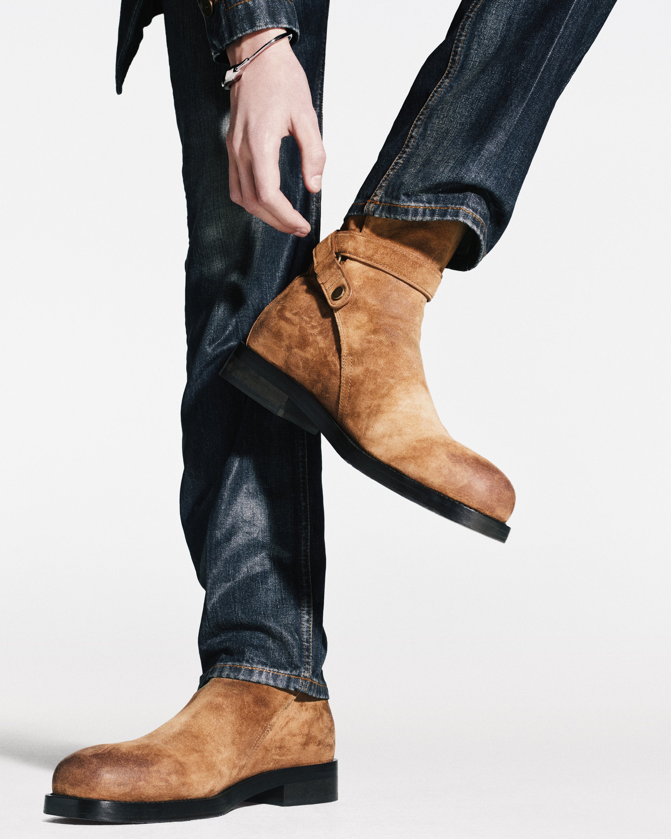 また、本コレクションでは、モヘアウール、デニム、ウィップステッチを施したレザーなどによる、細身でモッズライクなテーラリングが回帰します。3つボタンのジャケットは、ショート丈のシングルまたはダブルブレストで仕立てられ、テーパードのストレートパンツ、ストライプのシーアイランドコットンシャツ、バーバリーチェックをジャカード織りで表現した細身のシルクタイと合わせて提案されました。
