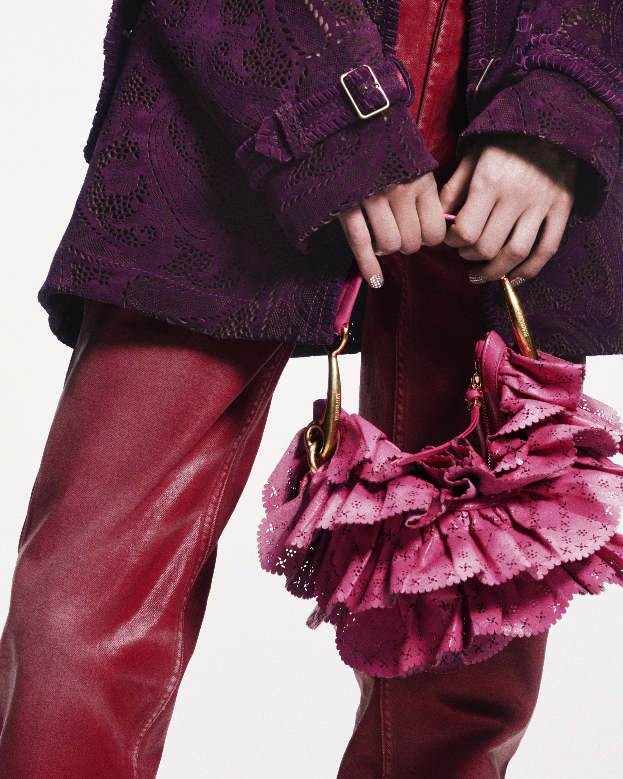 スエードやレザーのコートは、植物由来のタンニンでなめしたカーフスキンにパイソンプリントを施したものや、レースのように繊細なペイズリー柄のレーザーカット、ウィップステッチやフリンジなどのディテールが施されたデザインが登場しています。