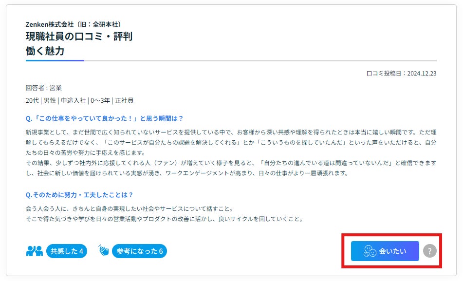 Zenken株式会社(本社:東京都港区、代表取締役社長:林 順之亮、以下 Zenken)が運営する、現職社員の口コミサイト「VOiCE」は、2025年7月31日、求職者と企業をつなぐ「会いたい機能」をリリースしました。