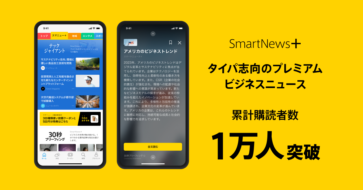有料ビジネスニュースとクーポンを集約した購読サービス「SmartNews+」、提供開始1カ月半で累計購読者数1万人を突破