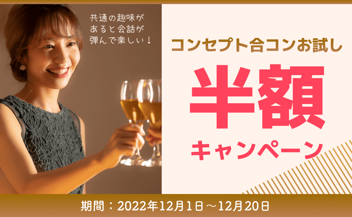リリース記念として半額キャンペーンを実施します。一人でのご参加はもちろん、友人とご一緒に参加も大歓迎!是非この機会にコンセプト合コンへのご参加をお待ちしております。