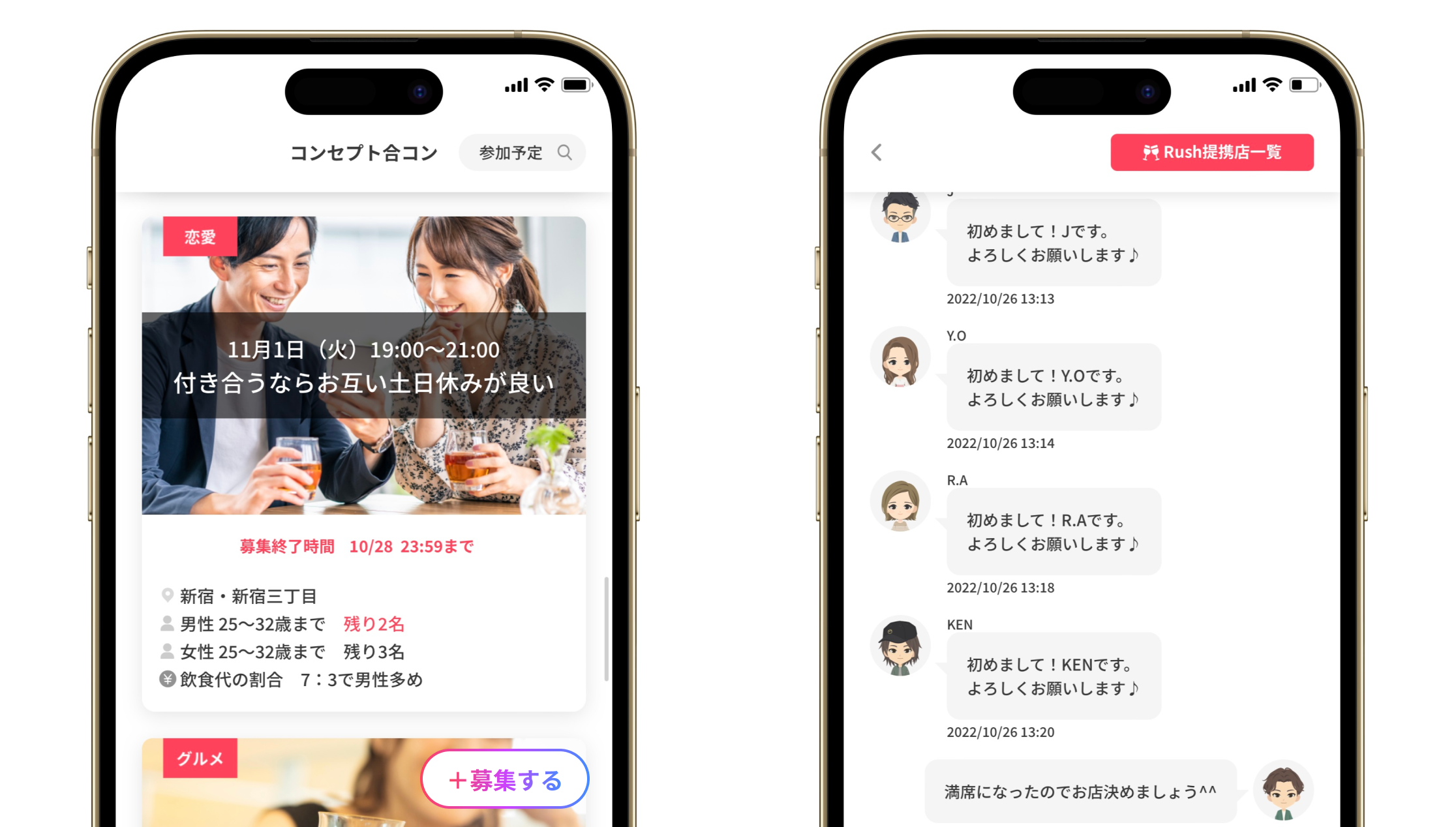 企画毎にコンセプトを設定し、共通の趣味や同じ価値観をもったメンバーで集まり、合コンが開催できるサービスです。人数は3対3から4対4で、規定の人数が集まれば開催が確定となります。合コンの会場はRush提携店より選択でき、グループチャットで相談しながら決めることができます。