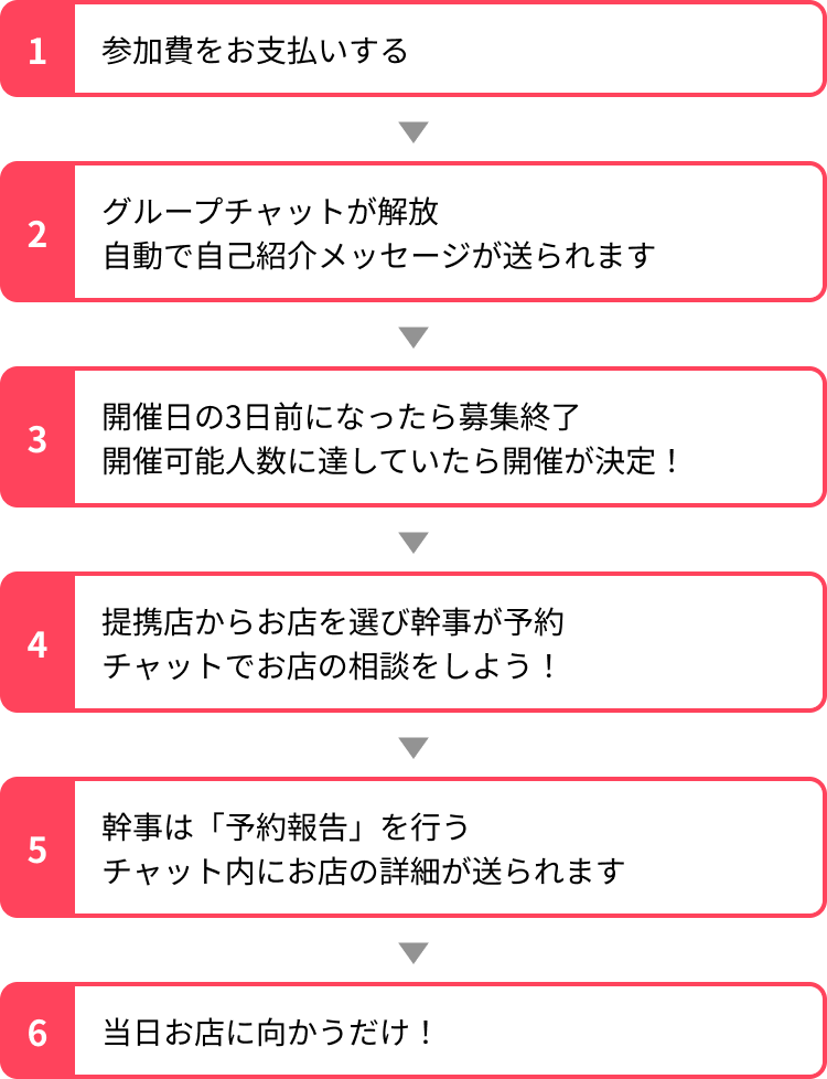 開催日の3日前に開催の有無が確定するので、直前まで予定がわからない…ということもなく、初めての方でも安心してご参加いただけます。また、参加者同士のグループチャットでやりとりもできるので、事前にコミュニケーションをとることも可能です。
