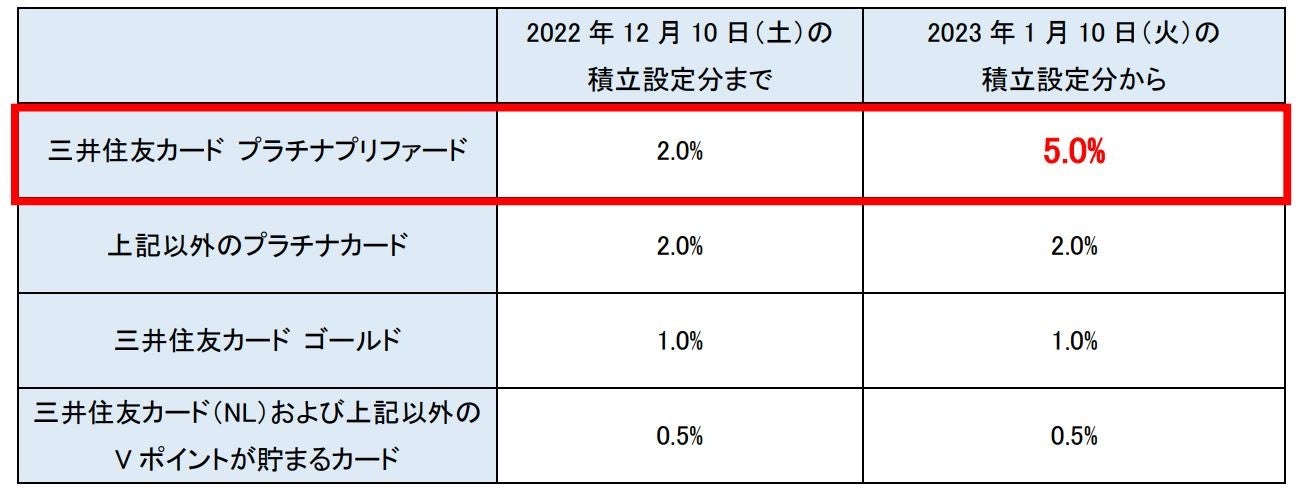 株式会社SBI証券(本社:東京都港区、代表取締役社長:髙村正人、以下「当社」)は、2022年12月21日(水)に、三井住友カード株式会社(代表取締役社長:大西幸彦、以下「三井住友カード」)が発行するクレジットカードで投資信託が買える投信積立サービス「三井住友カード つみたて投資」において、「三井住友カード プラチナプリファード」(以下、プラチナプリファード)のVポイント付与率を、これまでの2.0%から業界最高※となる5.0%に大幅に引き上げますので、お知らせします。