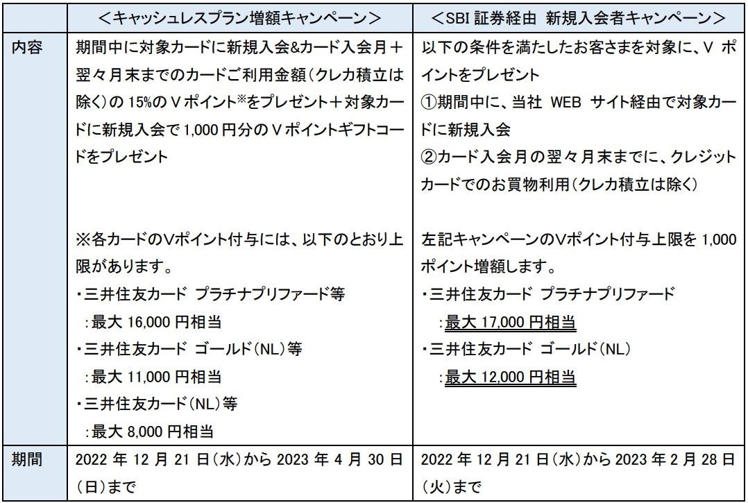 また、同日から、キャンペーン対象のクレジットカードに当社WEBサイト経由で新規で入会されたお客さまを対象として、「キャッシュレスプラン増額キャンペーン」(最大15,000円相当のVポイント+1,000円分のVポイントギフトコードをプレゼント)のVポイント付与上限を1,000ポイント増額し、最大17,000円相当のVポイントを獲得できるキャンペーンを実施します。
