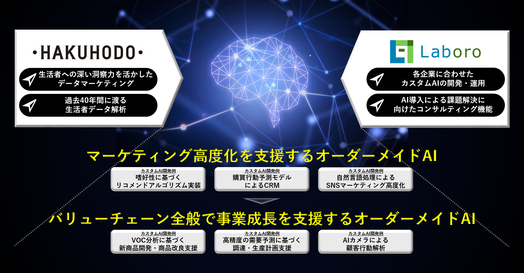 今回の提携で両社は、幅広い業界におけるクライアント企業が抱えるマーケティング課題に対して、『オーダーメイドでのAIソリューション』を提供するチームを組成します。博報堂のマーケティング知見とLaboro.AIのAI対応力により、AIを用いた課題の発見・設定・解決プランの提案、各企業のニーズにあったAIの開発・ビジネス実装・運用までを提供してまいります。一例として「嗜好性に基づくレコメンドアルゴリズムの開発・実装」や「顧客行動予測モデルによるCRM高度化」など、個々のクライアント企業の課題や生活者ニーズに寄り添った施策をオーダーメイドで提供してまいります。