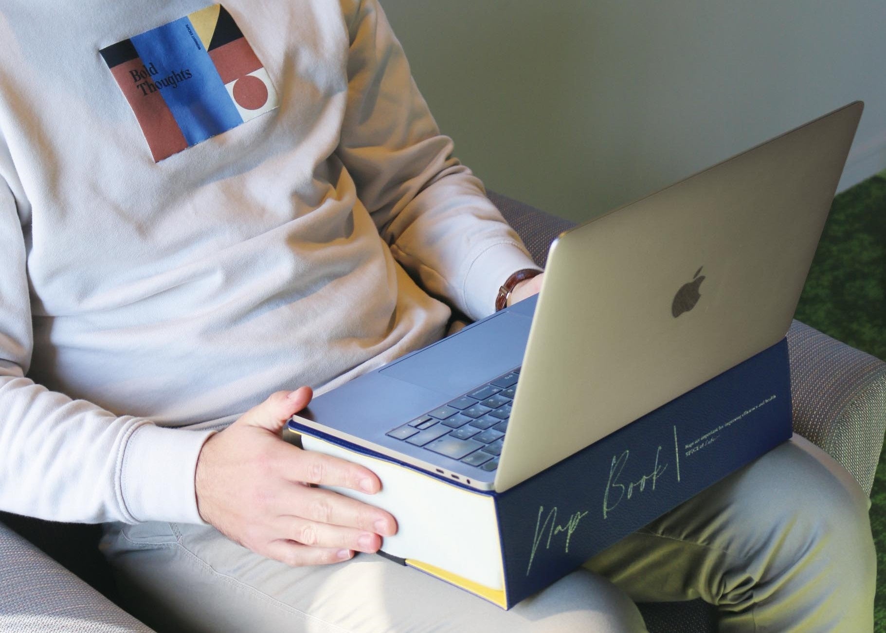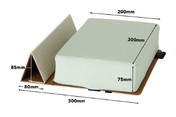 NapBookの厚みは8.5cmで、カバーがあることで天面が安定し、膝上テーブルに早変わり。
