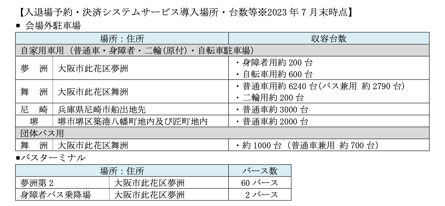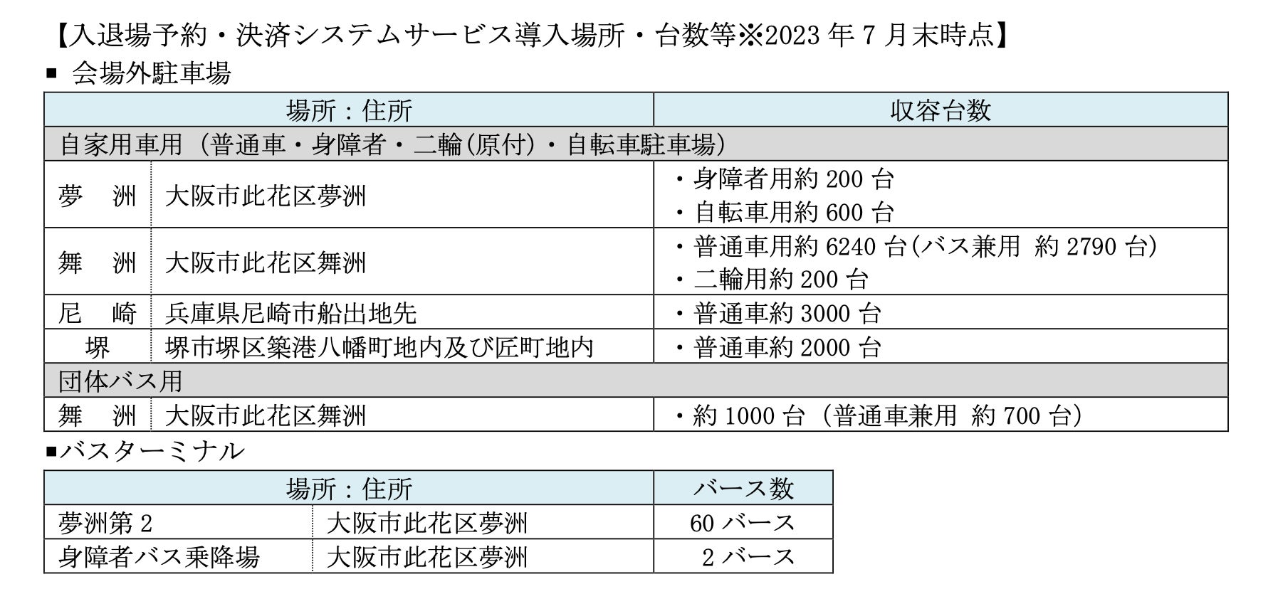 入退場予約・決済システムサービスを提供する会場外駐車場は4カ所で、約13,300台分の駐車スペース、バスターミナルは62のバースとなる予定です。