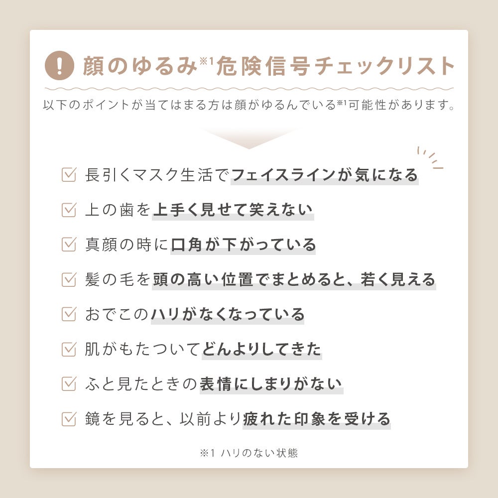 2023年3月にマスク着用が自由化、5月には新型コロナウイルスの感染症法上の位置付けが5類に移行され、約3年間続いたマスク生活にも終わりがみえてきました。顔を動かさないマスク生活が長期化したことで、顔の表情筋は運動不足の状態となり、もたついて冴えない印象を与えてしまうことがあります。脱マスクが進むなか、特に気になるのが「顔のゆるみ***」ではないでしょうか。