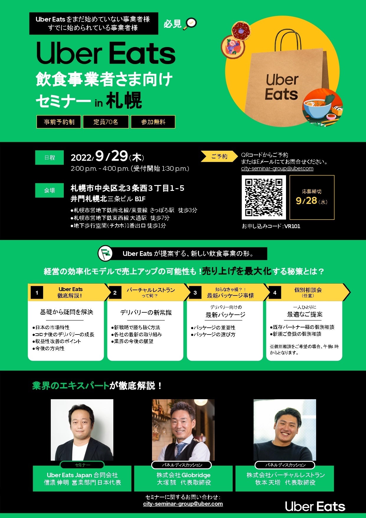 さらにセミナー終了後には、Uber Eats を運営していく中での疑問や人気のレストランが行っている対策など、Uber Eats スタッフに個別相談が可能です。 貴重な札幌エリアでの開催ですので、奮ってご参加ください。