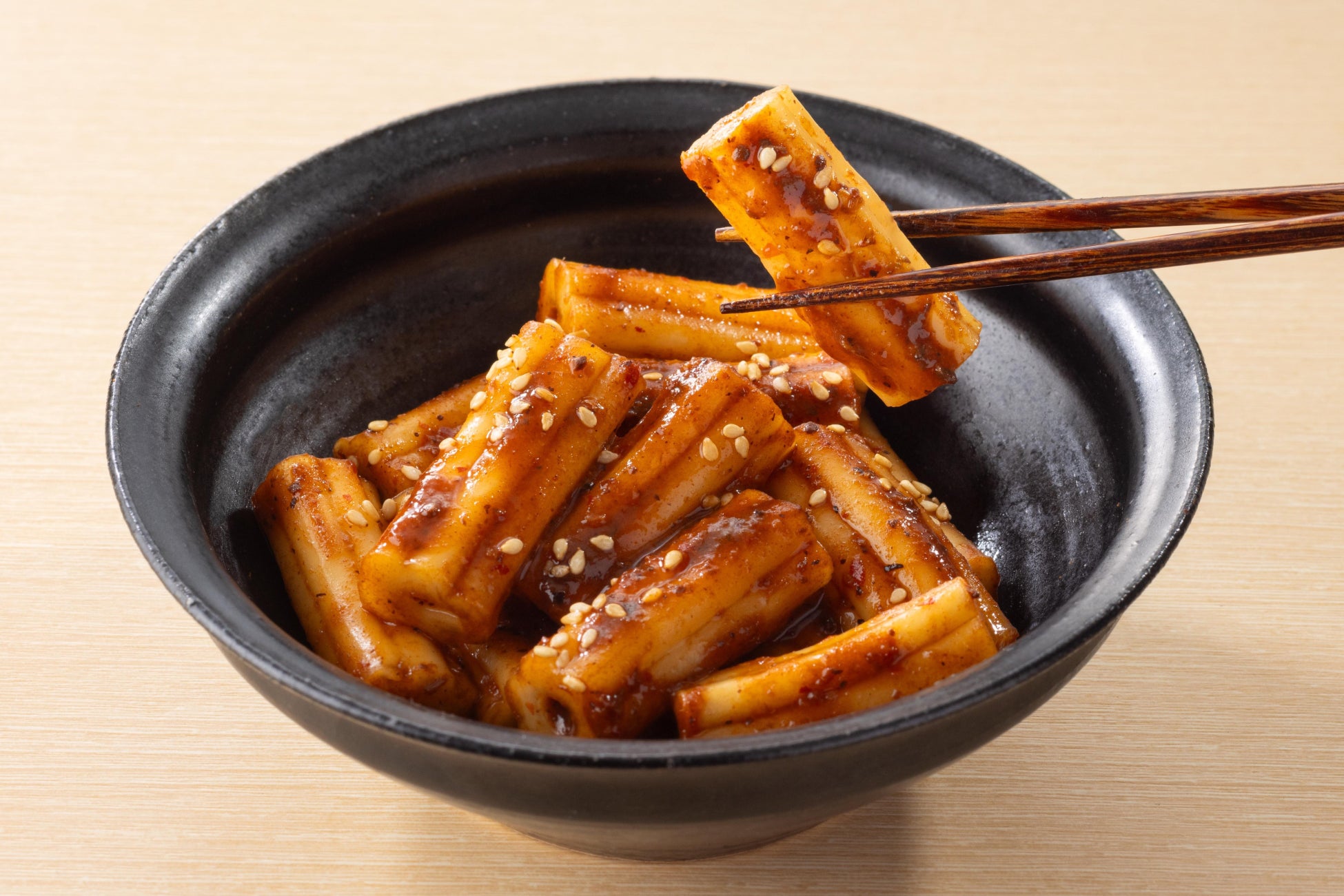 加熱してぷるもち食感になったブンモジャに麻辣醤だれとごまを絡めた一品。ピリッと辛い濃いソースとよく合います。