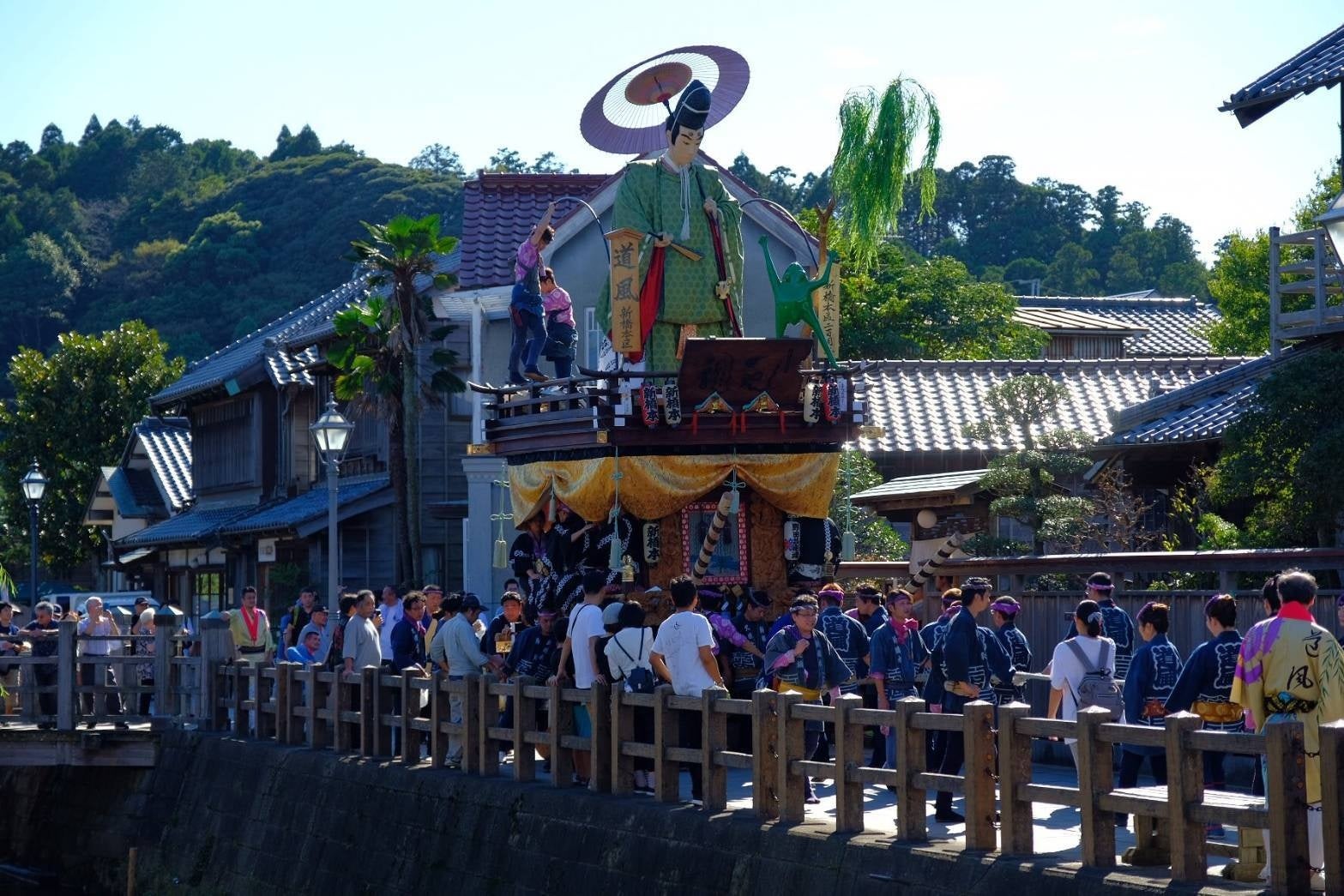 佐原は、利根川の支流・小野川と香取街道が交わる地点に位置し、江戸時代には水運の要衝として大いに繁栄したまちです。江戸と地方をつなぐ物流の拠点として全国から商人や旅人が集まり、「江戸まさり」とも称されるにぎわいを見せました。こうした町人文化の中で生まれたのが、佐原の総鎮守・諏訪神社の祭礼を起源とする「佐原の大祭」です。地域の商人たちが町の繁栄と誇りを表すために競って山車を出し、華やかな装飾と力強い囃子で祭りを盛り上げてきました。現在も続くこの伝統行事は、国の重要無形民俗文化財およびユネスコ無形文化遺産「山・鉾・屋台行事」に登録されており、江戸の粋を色濃く残す日本屈指の祭りとして高く評価されています。