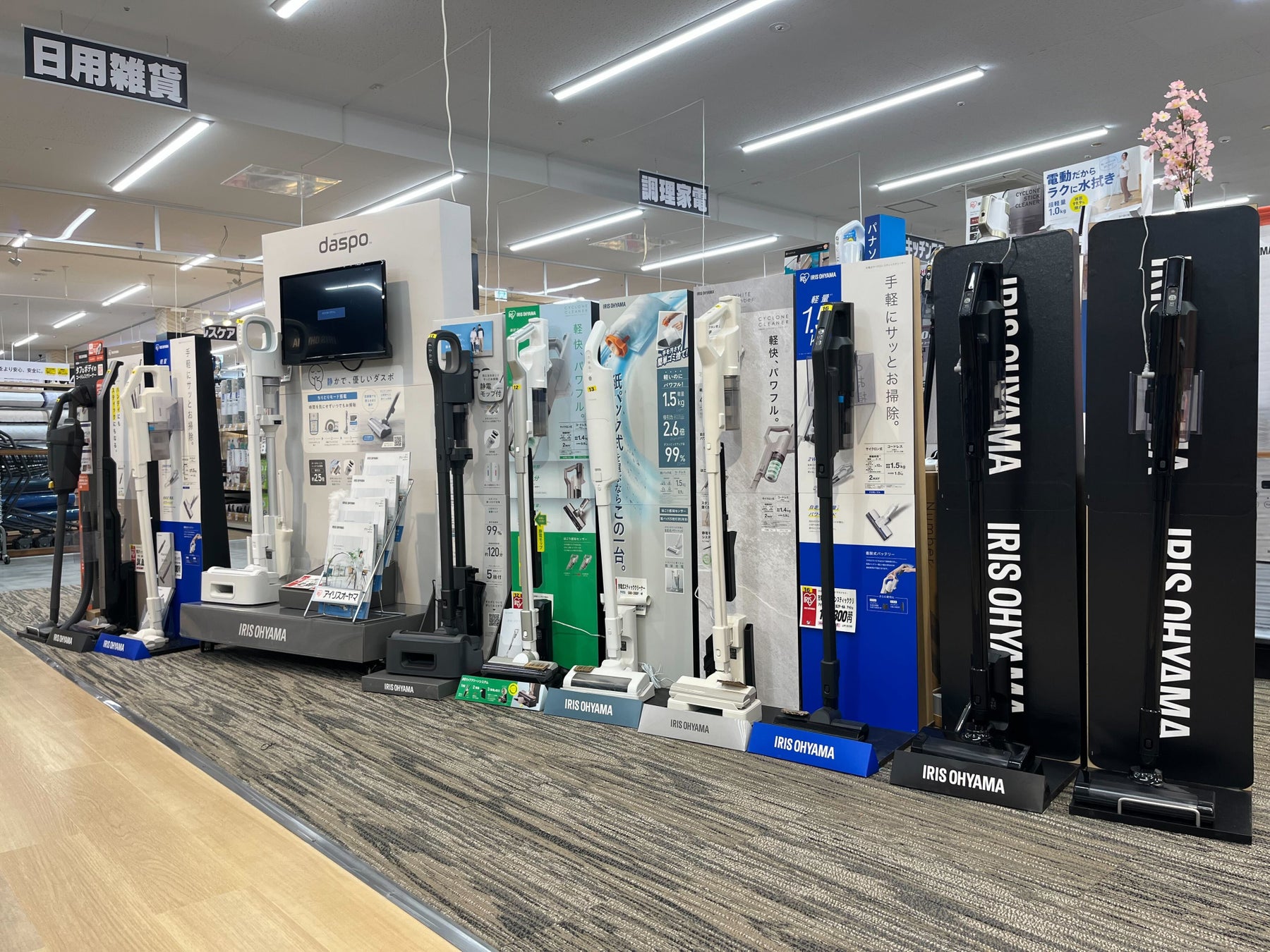 「家電コーナー」は、アイリスオーヤマの「なるほど家電®」を約1,000種類取り揃えています。328㎡の売り場に、冷凍庫、冷蔵庫、洗濯機、エアコンなどの大型家電や、掃除機、炊飯器、電子レンジなどの小型家電を種類豊富に展開します。大型家電は、ダイシンの強みである自社の配送・施工サービスにより、最短で購入即日に配送・設置できます。そのほか、小型家電は「コードレスクリーナー体験コーナー」など手に取って試用できる環境を整えています。
