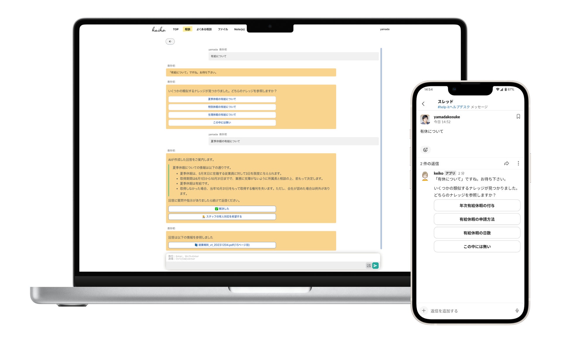 2022年9月より提供を開始した「helpmeee! KEIKO」は、社内問い合わせ対応のDX化を推進する、最新の生成AIを活用したソリューションです。PDFなどのファイルのアップロードやストレージサービスとの連携だけで活用できる容易さや、独自に開発したAI搭載の有人(オペレーター)対応システムやチケット管理機能による業務効率化が評価され、上場企業を中心に導入が広がっています。