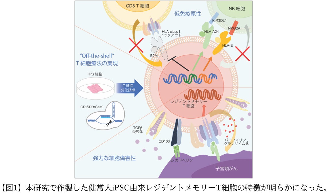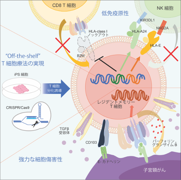 以上より、本研究ではiPS細胞技術とゲノム編集技術を用いて、健常人由来iPS細胞から患者免疫細胞の攻撃を回避できるHPV-CTLの作製に成功し、作製したHPV-CTLは組織レジデントメモリーT細胞を豊富に含む結果、子宮頸がんに対して強力な細胞傷害活性をもたらすことを明らかにしました。同種免疫反応を軽減でき、かつT細胞の機能も強化された次世代T細胞療法の開発に成功したことにより、HPV-CTLは子宮頸がんに対する画期的な新規治療となりうることが示唆されました(図1)。