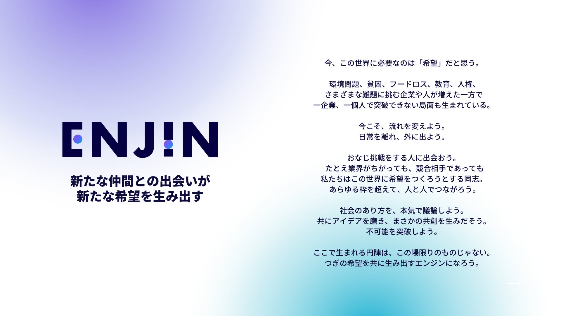 「ENJIN」は、ボーダレスが2024年に初開催した合宿型の招待制イベントです。業界や業種を越えて、"ともによりよい社会をつくりたい"という志を持つ仲間たちが一堂に会し、互いの視点や熱量をぶつけ合いながら、未来への一歩を踏み出す場として生まれました。