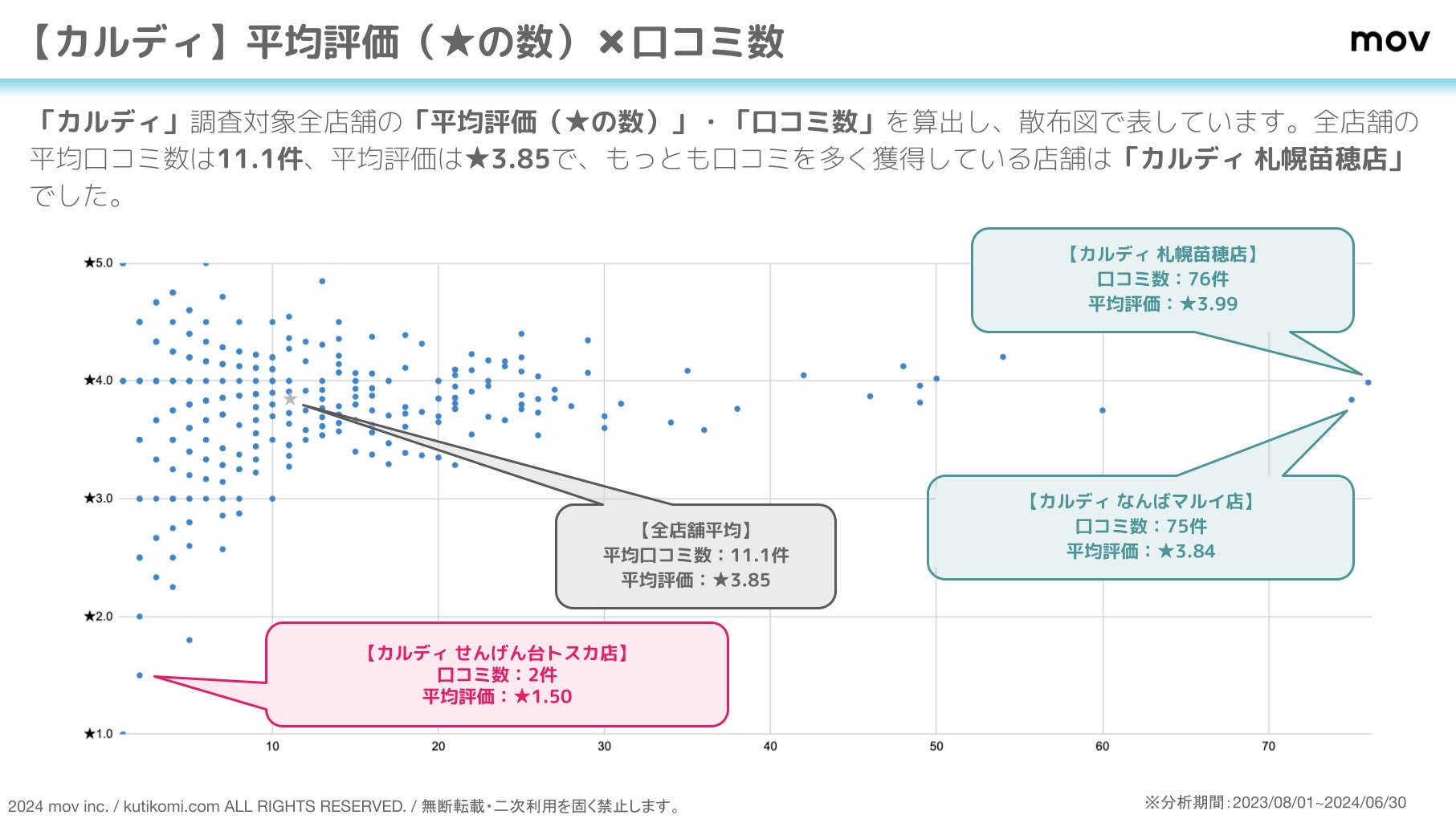 「カルディ」調査対象全店舗の「平均評価(★の数)」・「口コミ数」を算出し、散布図で表しています。全店舗の平均口コミ数は11.1件、平均評価は★3.85で、もっとも口コミを多く獲得している店舗は「カルディ 札幌苗穂店」でした。