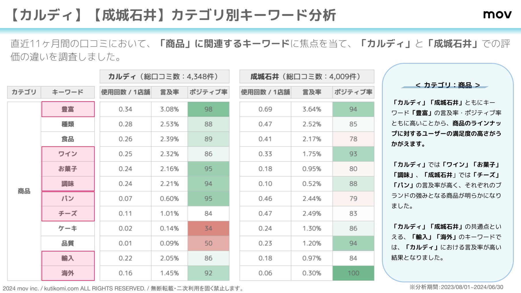 「カルディ」「成城石井」ともにキーワード「豊富」の言及率・ポジティブ率ともに高いことから、商品のラインナップに対するユーザーの満足度の高さがうかがえます。